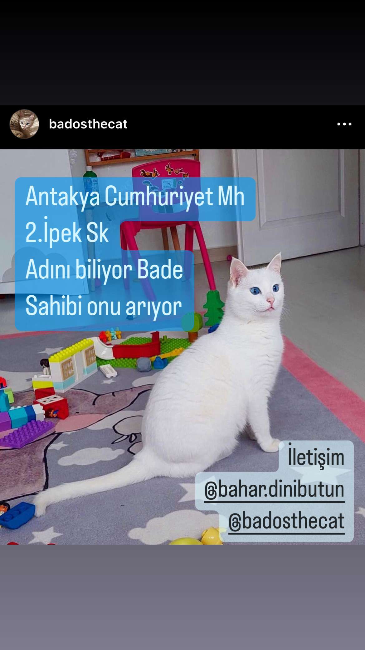 Bade isimli kedimiz Antakya Cumhuriyet Mh 2.İpek Sk’ta yarısı yıkılan binada kayıp. Sahibi ve mahalleli onu arıyor, ismini biliyor. Beyaz, mavi gözlü, dişi, tasma vs yok. Görenlerin sahibi Bahar’a ulaşmasını bekliyoruz +90 (545) 763 92 57