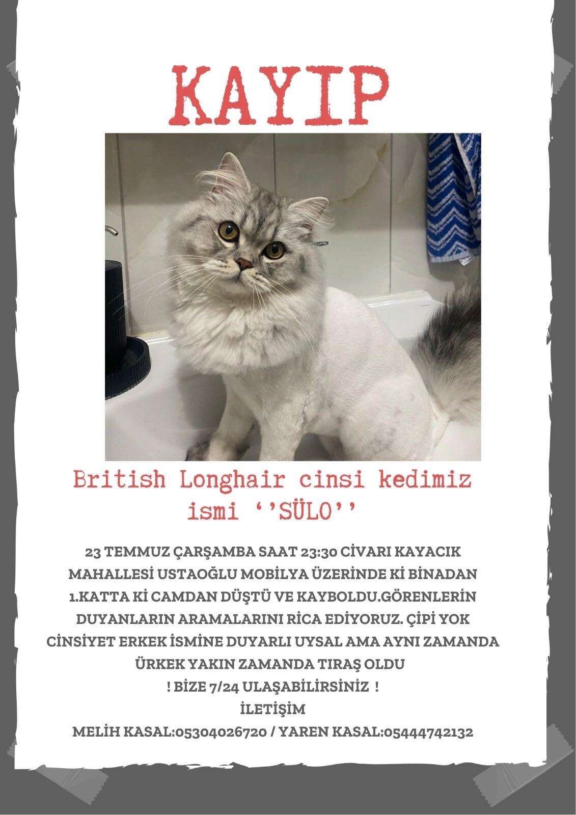 23 Temmuz Çarşamba Balıkesir/Bandırma İlçessinde Saat 23:30 civarı Kayacık mahallesi Ustaoğlu mobilya civarında camdan düştü ve kayboldu rica etsem paylaşırmısınız gören duyanın aramasını rica ediyoruz çipi yok ismi Sülo ismine duyarlı cinsi British Long Hair uysal ama aynı zamanda ürkek yeni traş oldu İLETİŞİM:Melih Kasal:05304026720 Yaren Kasal:05444742132