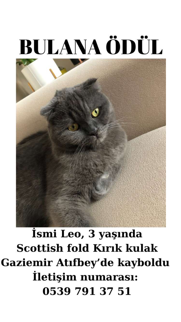 İsmi Leo ve adına duyarlı. Scottish fold gri erkek, 3 yaşında kısır ve çipli, Gaziemir Atıfbey mahallesinde kayboldu. 2 gündür kayıp. Boynunda tasması yok.
