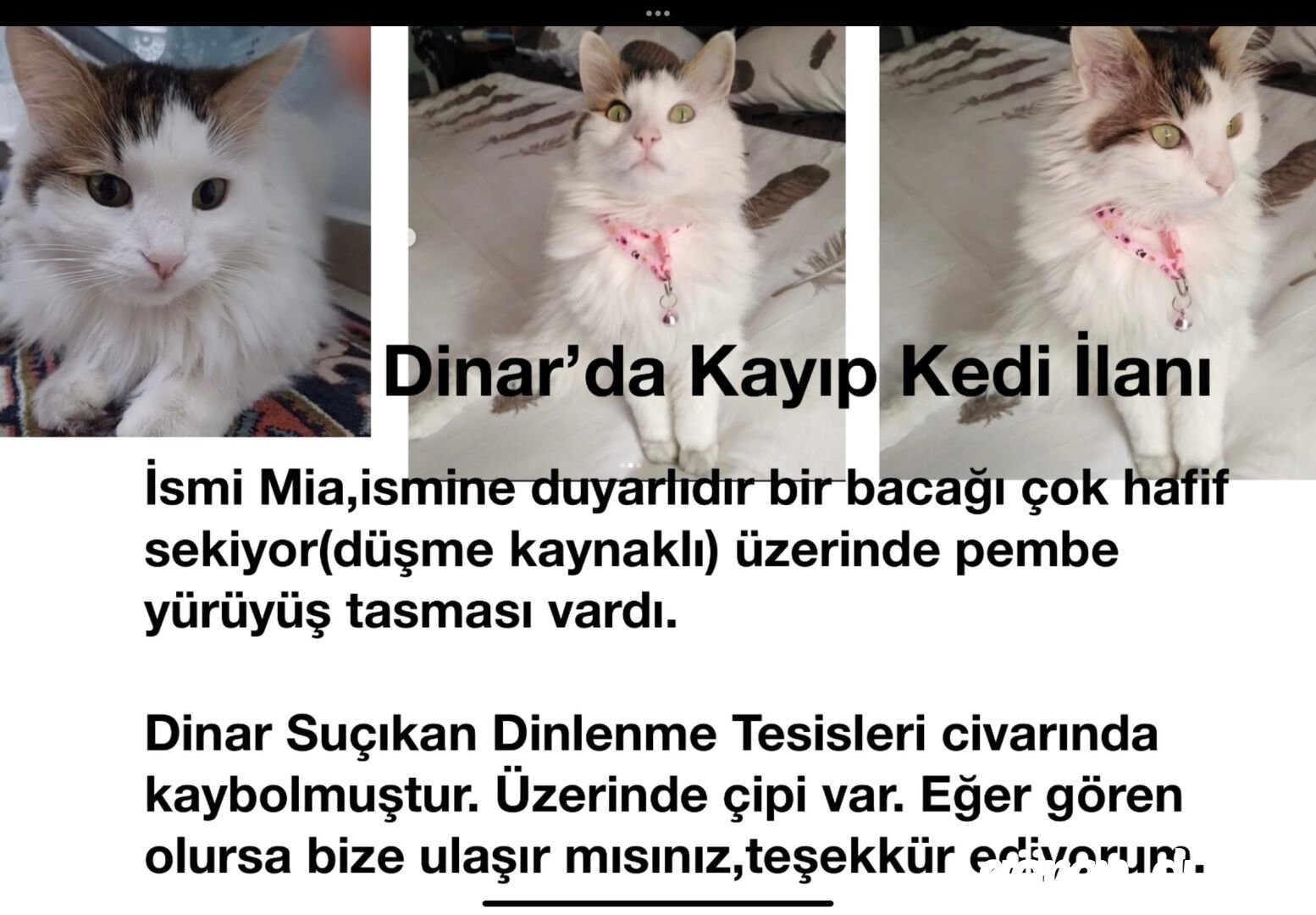 Dinar’da Kayıp Kedi İlanı İsmi Mia,ismine duyarlıdır bir bacağı çok hafif sekiyor(düşme kaynaklı) üzerinde pembe yürüyüş tasması vardı. Dinar Suçıkan Dinlenme Tesisleri civarında kaybolmuştur. Üzerinde çipi var. Eğer gören olursa bize ulaşır mısınız,teşekkür ediyorum.