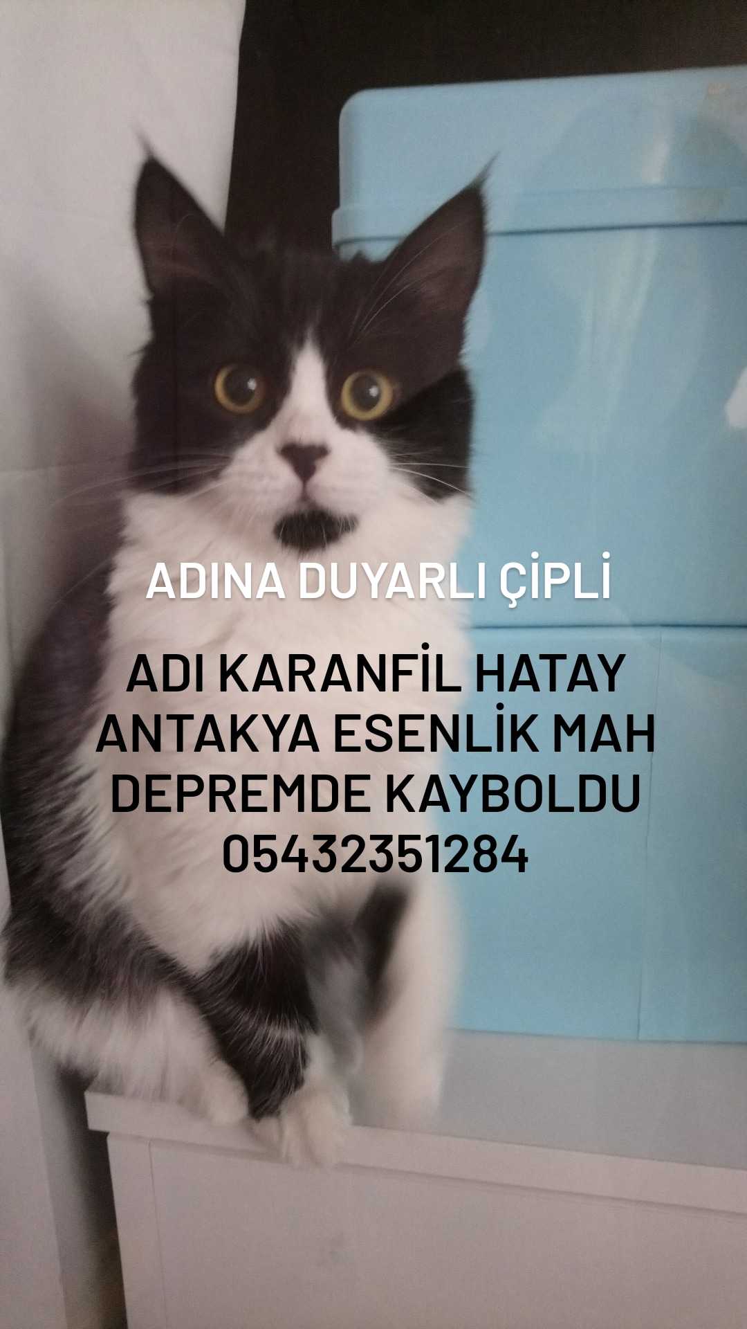 Adı karanfil depremde kayboldu Cinsi: siyah beyaz uzun tüylü smokin Çipli : 900233000717005 Antakya hatay esenlik mah