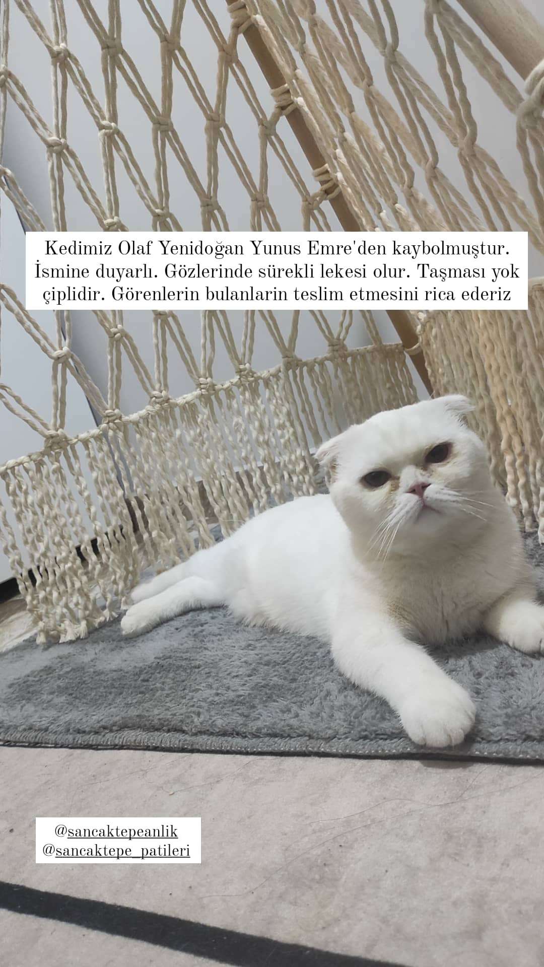 7 aylık erkek scottish cinsi beyaz renk. Başında 3 tel siyah tüyü var. Gözleri sürekli akar. Çiplidir.