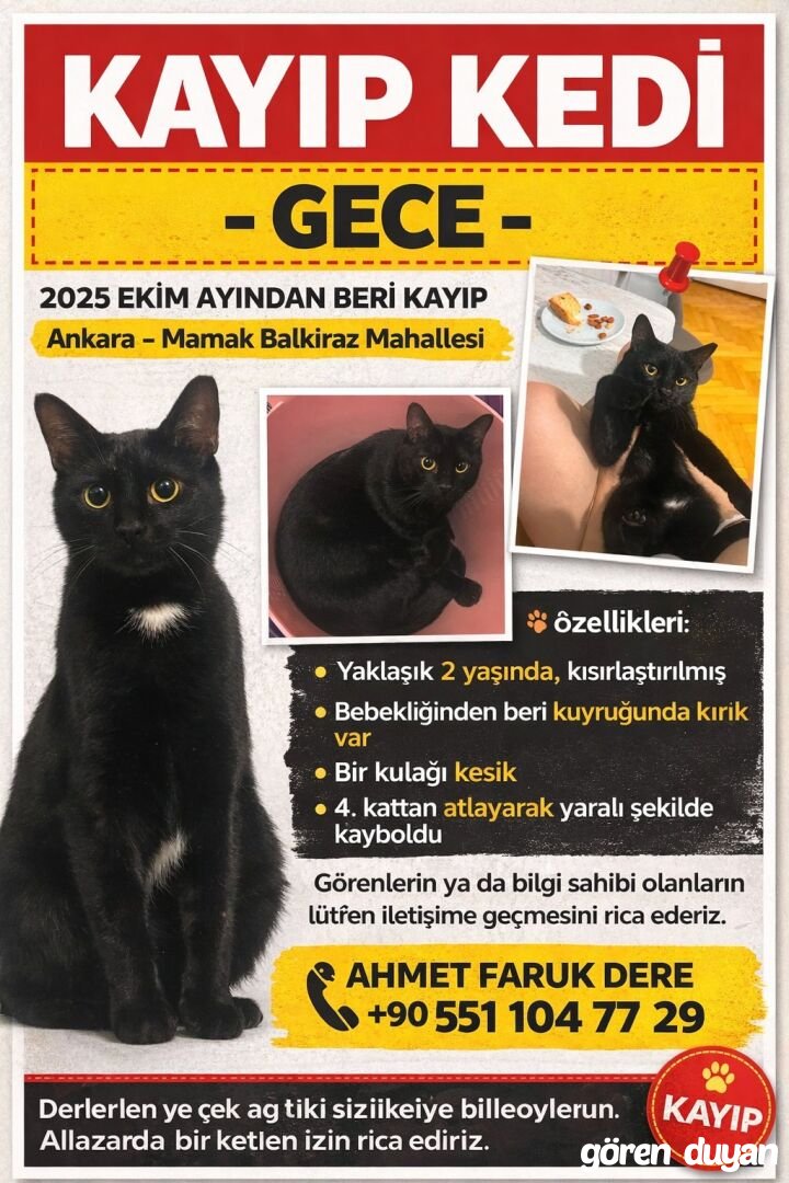 Gece, yaklaşık 2 yaşında, kısırlaştırılmış erkek bir kedidir. Bebekliğinden beri kuyruğunda belirgin bir kırık bulunmaktadır ve bir kulağı kesiktir. İnsanlara alışkın, sakin huylu ve tanıdıklarına karşı sevecendir. Ekim 2025’ten beri kayıp olup Ankara’nın Mamak ilçesi Balkiraz Mahallesi’nde, 4. kattan atlayarak yaralı bir şekilde kaybolmuştur. Kaybolduğu sırada yaralı olabileceği için görülmesi halinde dikkatli olunması rica olunur.