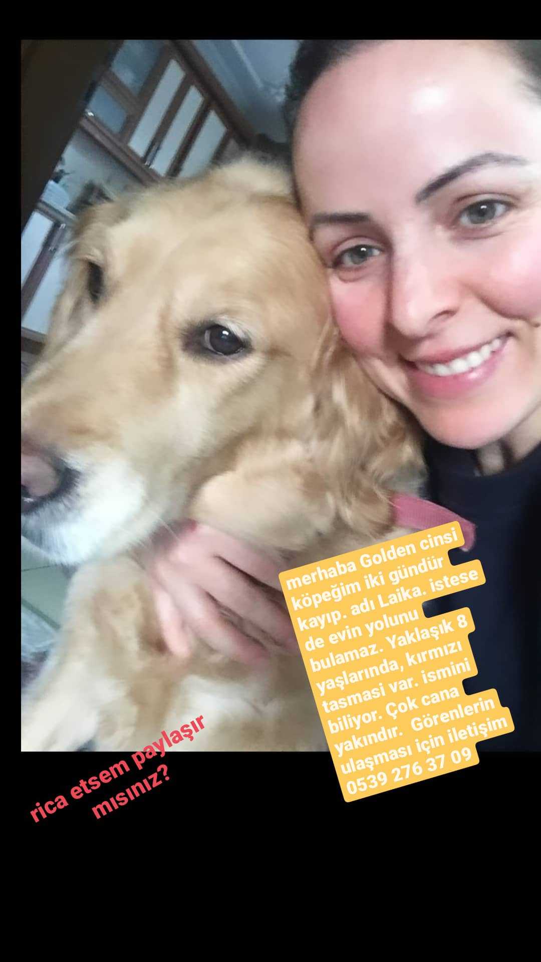 Golden cinsi köpeğim kayboldu Eskişehir odunpazarı Erenköy Mahallesinde oturuyorum Köpeğim yaklaşık 8 yaşlarında sarı tüylü, kırmızı, pembemsi yazmalı. Barınaktan alındığı için kulağının içinde dövmesi var. ismi Laika. ismiyle seslenince gelir. Facebook ve Instagram'da ilanları var görenlerin irtibata geçmesi rica olunur