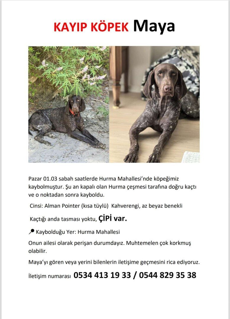 Pazar 01.03 saat 7.30 ta Antalya Hurma Mahallesi’nde köpeğimiz kaybolmuştur. Kapalı olan çeşme tarafına doğru kaçtı ve o noktadan sonra kayboldu. Cinsi: Alman Pointer (kısa tüylü) Rengi : Kahverengi, az beyaz benekli ADI : Maya Kaybolduğu anda tasması yoktu. ÇİPİ VAR. Onun ailesi olarak perişan durumdayız. Muhtemelen çok korkmuş.
