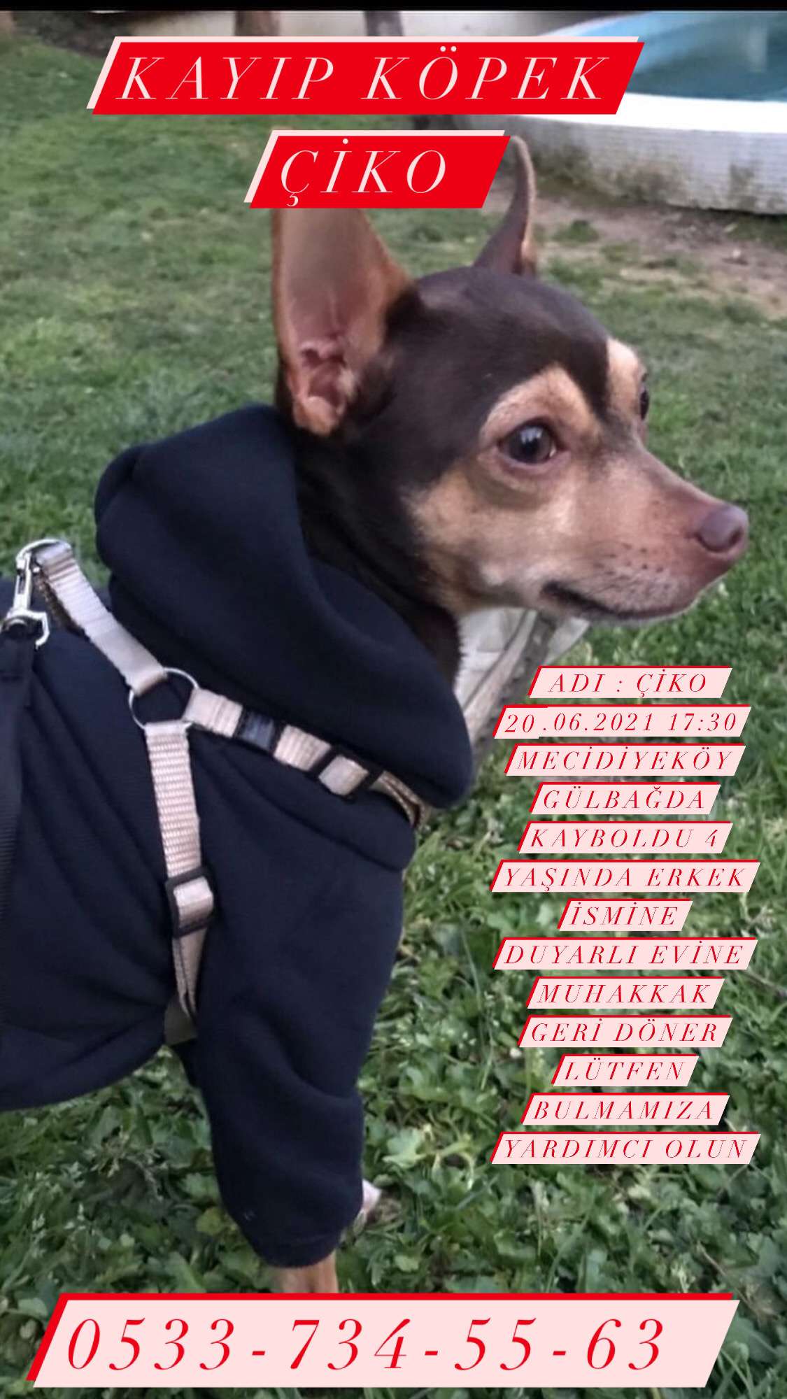 İSMİ ÇİKO 4 YAŞINDA ERKEK 26.06.2021 17:30 TARİHİNDE MECİDİYEKÖY MAHALLESİ GÜLBAĞDA KAYBOLDU İSMİNE DUYARLI TASMASIZ GEZMEYE ALIŞKIN BİRİNİN ALDIĞINI DÜŞÜNÜYORUM LÜTFEN BULMAMIZDA YARDIMCI OLUN - @cemretoprakbayraktar