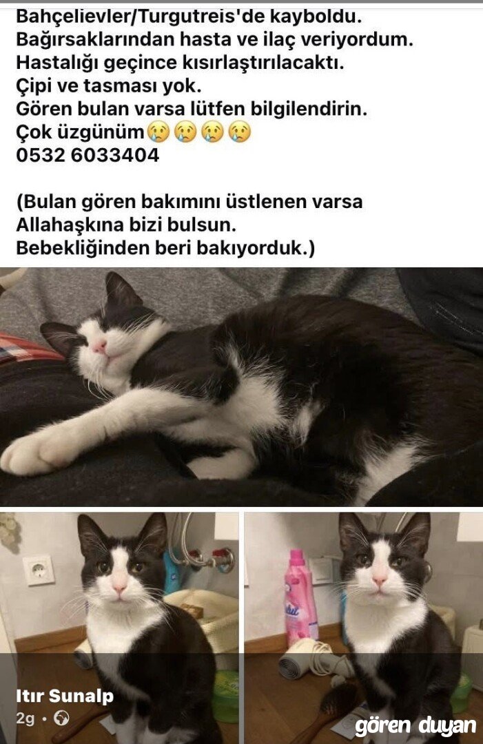 5,5 Aylık erkek kedim 28 Şubat'da kayboldu.😭 Kısırlaştırılmadı. Bağısaklarından rahatsız ilaç ve özel mama veriyordum tedavisi yarım kaldı.