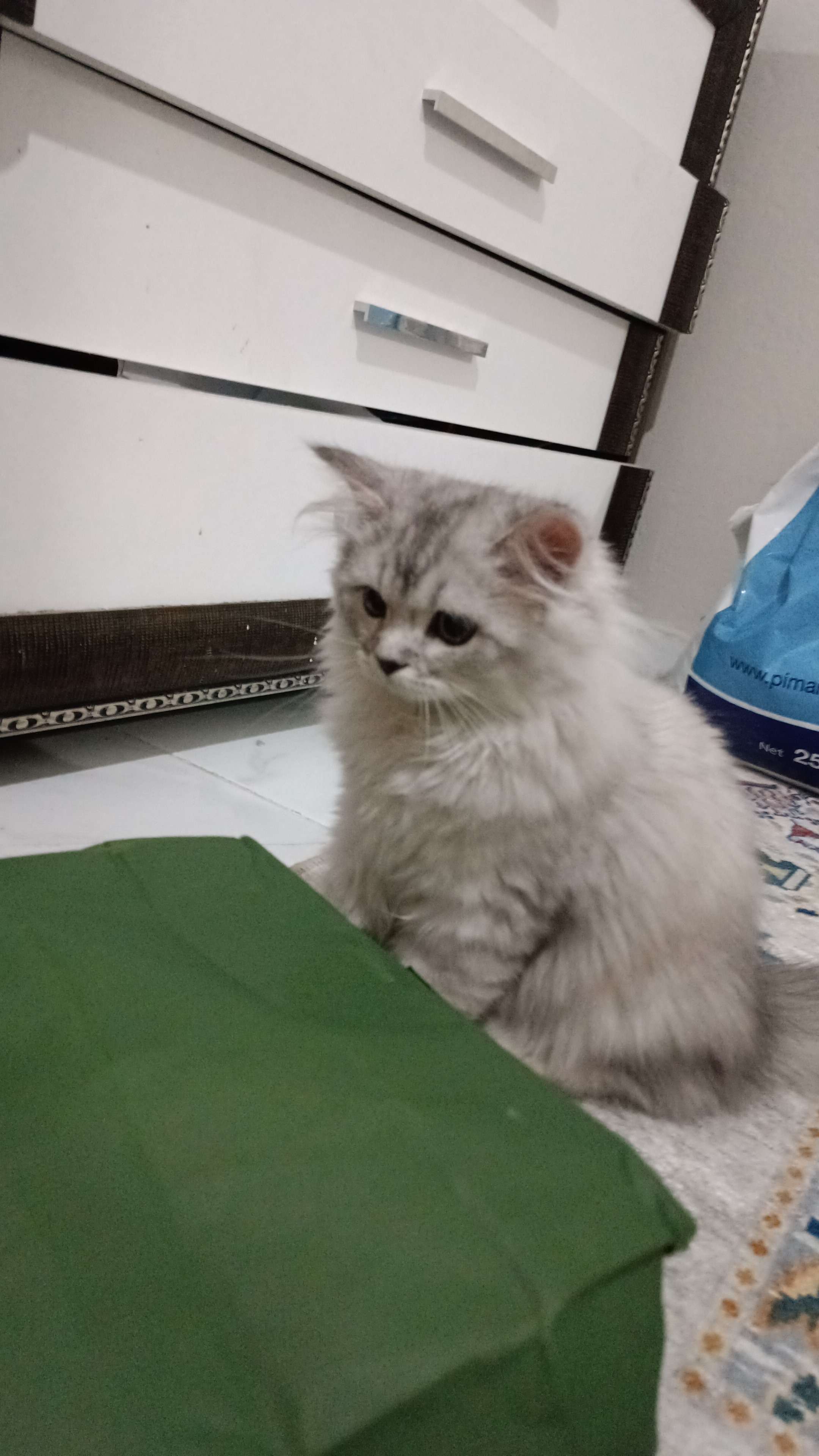 Mehmet Akif Mahallesi'nde bir evin kapısında dolanırken görülmüş. Bana geldi cipine baktirdim ama yoktu. Yaklaşık 4 aylık civarı. Yeni kaçmış belli. Tertemiz ve eve insana çok alışık. Beyaz üzeri hafif gri renkleri var. Sahibinin bir an önce bulmasını bekliyoruz
