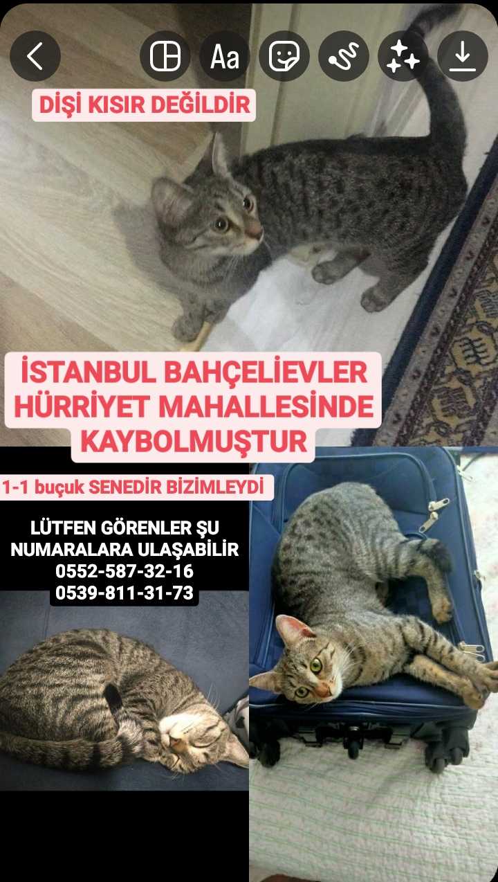 dişidir, kısırlaştırılmamıştır. çok ürkek bir kedidir. İsmi marinadır. kaybolduğu yer bahçelievler Hürriyet mah. derya sok. da kayboldu. öğlen 12.30da kayboldu