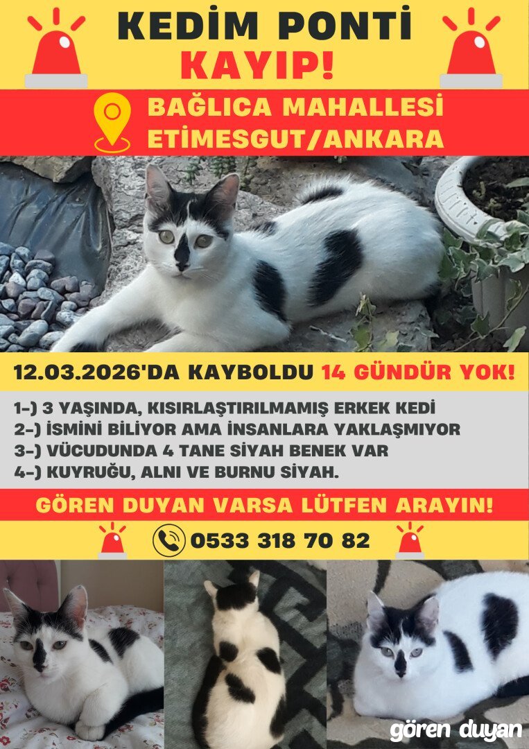 Vücudunun her iki yanında 2'şer siyah büyük benek, Burnu, alnı, ensesi ve kuyruğu siyah, kalan kısımları beyaz, 3 yaşında kısırlaştırılmamış erkek kedi, 12 Mart 2026 tarihinde saat 15:00 sularında en son bahçede görüldü. İsmini biliyor ama insanlara yaklaşmıyor. 2 haftadır kayıp olduğundan dolayı zayıflamış olabilir! Bahçenize girmiş, sıkışmış ya da saklanıyor olabilir. Lütfen vaktinizi ayırıp etrafınıza bir göz gezdirin. Çok teşekkür ederim..