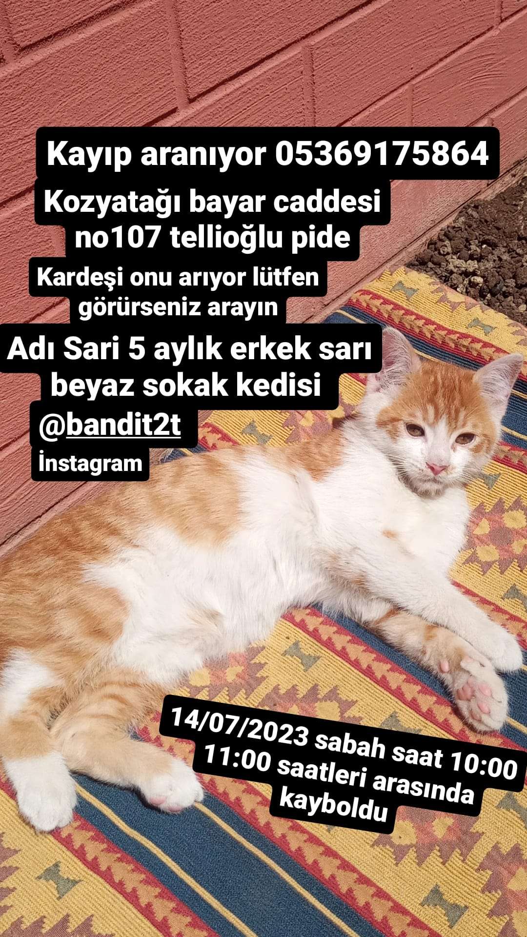 insta: bandit2t kardeşi onu arıyor lütfen gören duyan varsa arayın yada instagramdan mesaj atın EĞER BULUP SAHİPLENMEK İSTİYORSANIZ LÜTFEN ANLAYIŞLI OLUN İKİZ KARDEŞİ TIRTIL İSİMLİ KIZ KARDEŞİ SÜREKLİ MİYAVLAYIP ONU ÇAĞIRIYOR ANLAYIŞINIZ İÇİN TEŞEKKÜR EDERİZ MİNNETTARIZ