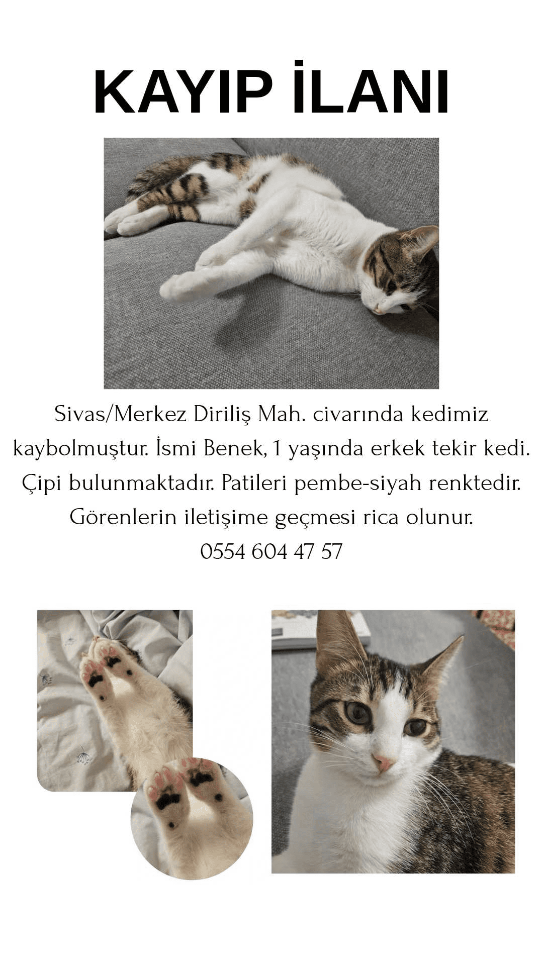 Sivas/Merkez Diriliş mahallesi civarında erkek, tekir kedimiz kaybolmuştur. Çipi bulunmaktadır. Kısırlaştırılmıştır. Görenlerin iletişime geçmesi rica olunur.