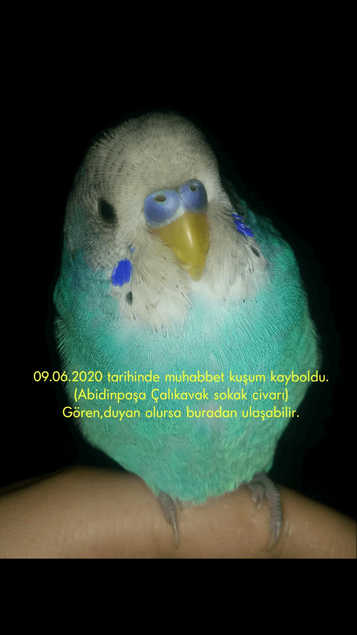 09.06.2020 tarihinde muhabbet kuşum kayboldu.Gören,duyan olursa lütfen ulaşsın.Kuşum mavi renkte ve 2 aylık.