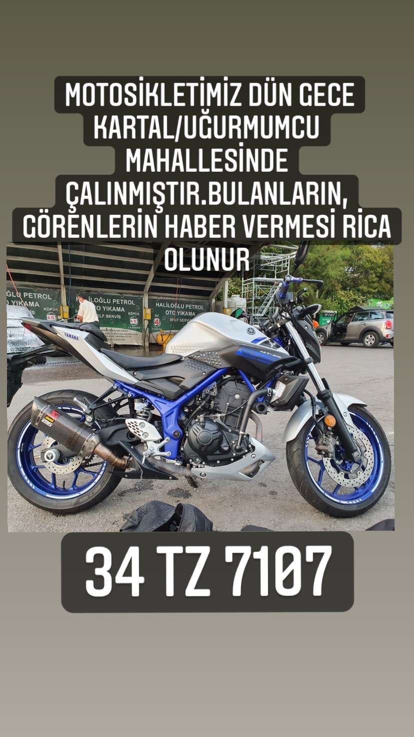Merhabalar 34 TZ 7107 plakalı yamaha mt25 model motosikletimiz uğurmumcu mahallesi kartal mevkiinden 17.09.2021 gecesi çalınmıştır.Motosikleti bulan ödüllendirilecektir.İletişim bilgilerimizden bize herzaman ulaşabilirsiniz.Teşekkürler