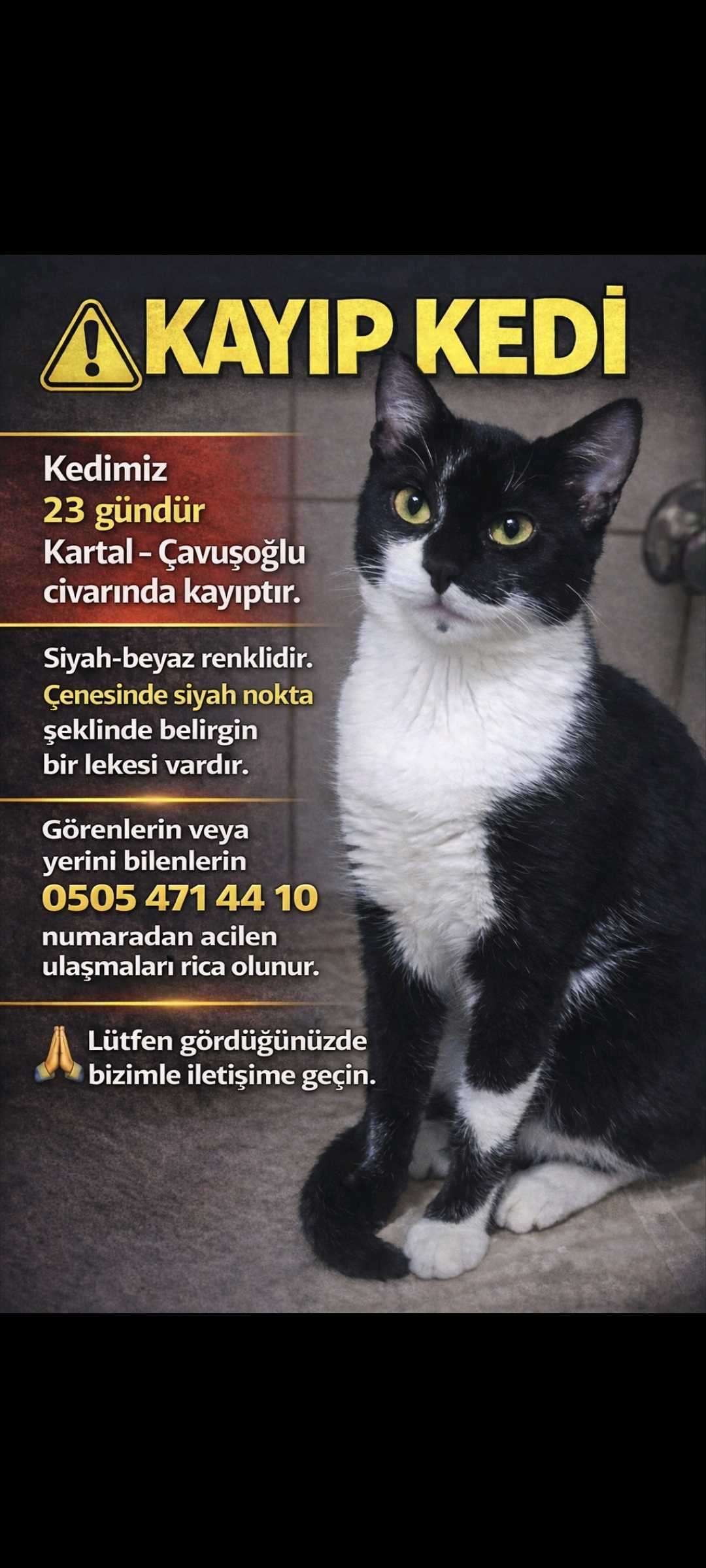 Kartal-Çavuşoğlu Muhtarligi bölgesinden kayboldu. Dişi kisir degil 8 aylik. Yaklasik 1 aydan beri kayip. o bolgede aramadigimiz yer kalmadi, araba motoru weya kamyon arkasinda yer degisikligi olmuş olabilir.