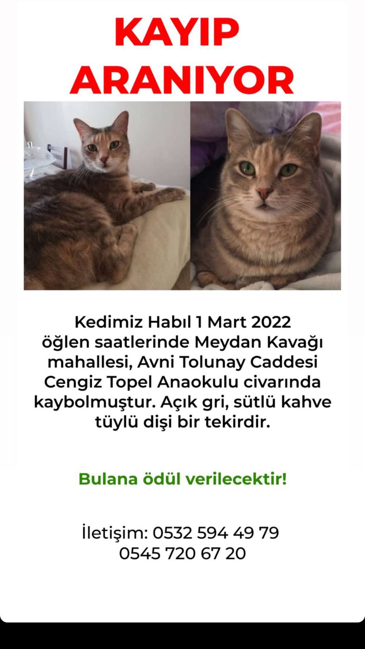 Kedimiz Habıl 01/03/2022 öğle saatlerinde Meydan kavağı mah. Avni Tolunay caddesi civarında kayboldu. Açık gri-sütlü kahve renginde kısır 4 yaşında dişi bir kedi. Arka ayakları hafif topallıyor. Sokaktan çok küçükken kurtarıldığı için çok korktuğunu ve gizlendiğini düşünüyoruz. Bulana ödül verilecektir