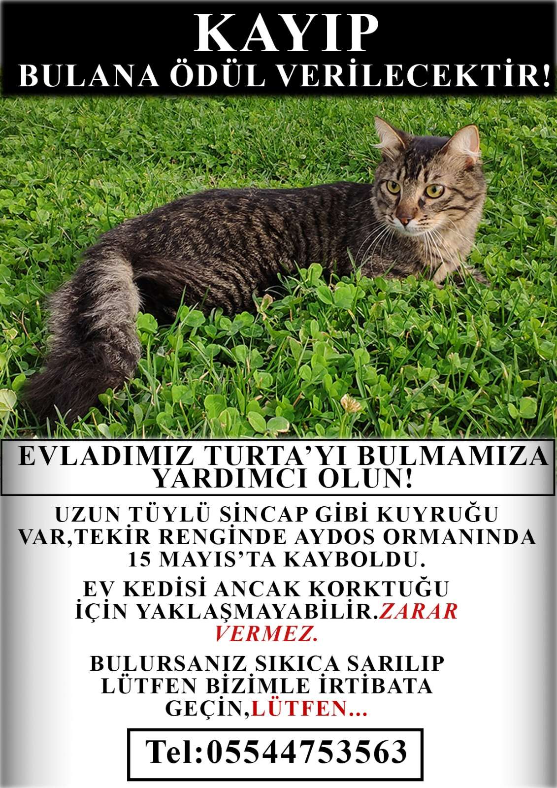 Arkadaşımın kedisi Aydos'ta kayboldu. Kürkü tekir renkte. Uzun tüylü. Özellikle kuyruğu kabarık bir kedi. 1 yaşında. Erkek. Kısır. Hiç sokakta yaşamadı. O yüzden çok endişeliyiz. Lütfen görenler duyanlar ilandaki numarayı arasın. Bulana çok büyük ödül verilecek.
