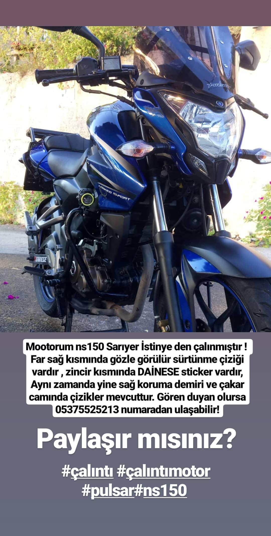Mavi siyah renkli Pulsar ns150 motorum çalınmıştır. Görenler lütfen şahsıma veya polise bildirsinler... Motorun belirgin özelliği: sağ far kısmında çok belli bir sürtünme izi var sağ koruma demiri ve sağ çakar camı da önceden kazadan dolayı çizik. Zincir kısmında DAİNESE sticker var ..