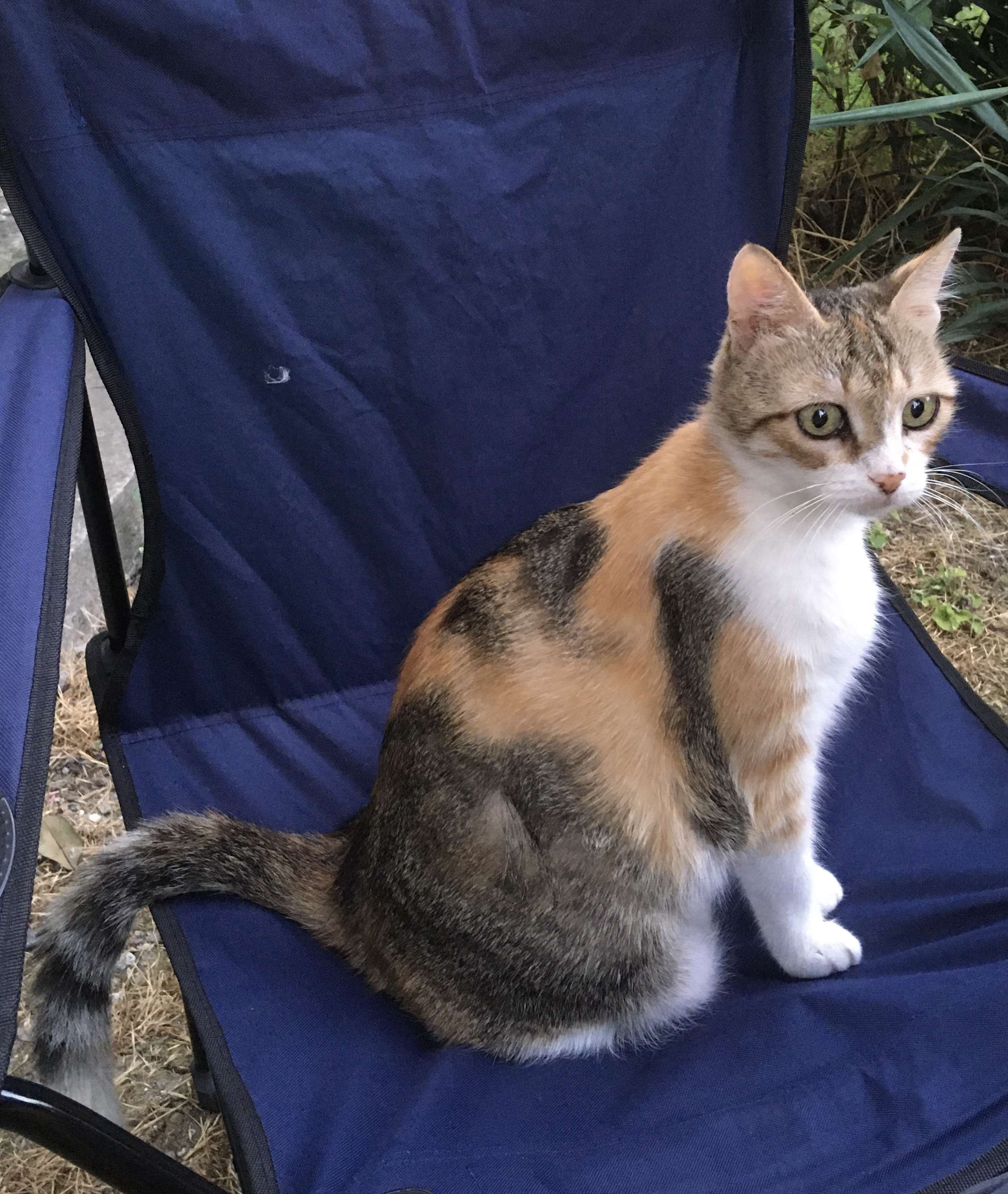 kedimiz 3 renkli bir kaliko. sırtında sarı, çilek desenli bir gezdirme tasması var. ismi kıjimato, ismini biliyor.