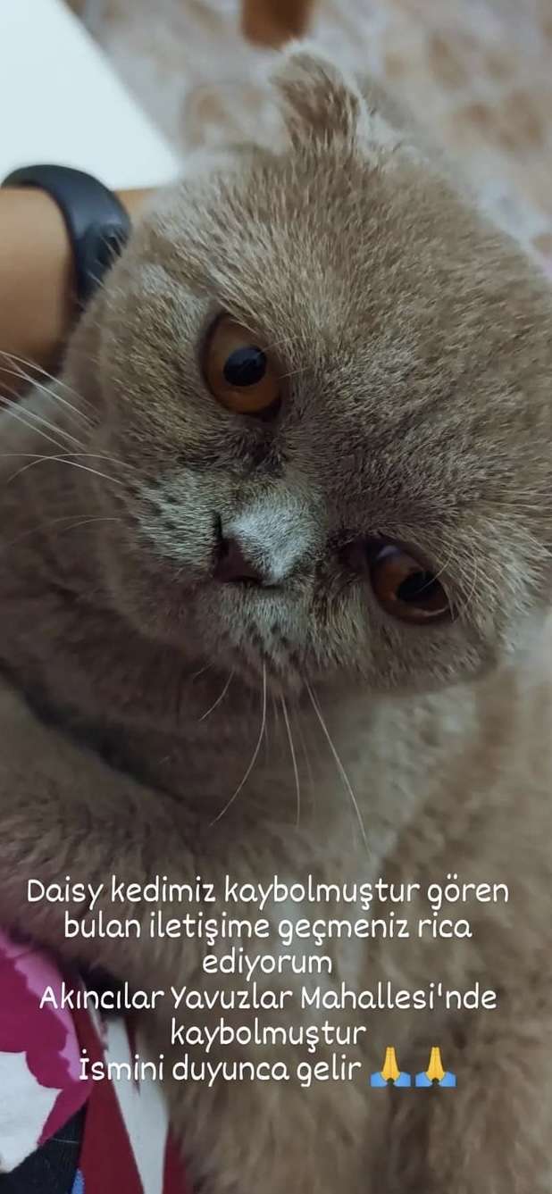 Scotish fold gri renk bal rengi gözlü desteklerinizi bekliyorum. Tek dostum tek arkadaşım o benim herşeyimdi. Bulana küçük bir süprizim olacaktır. ismini duyunca gelir ismi daisy.