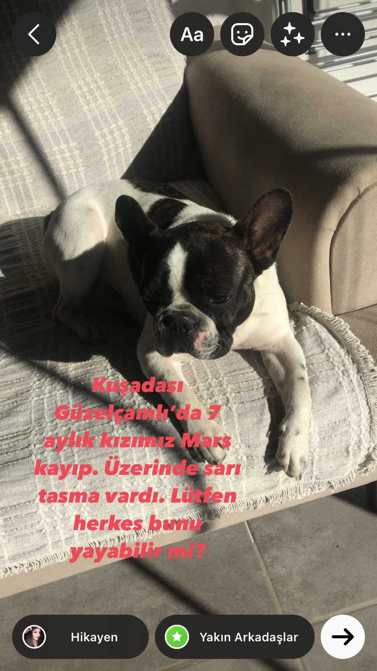 Kızımız Mars 6 ocak 2022 tarihi saat 16.00 sularında Aydın/Kuşadası Güzelçamlı’da (Aşina Sitesi, sarazena hotel, holiday otel, boztaş sitesi civarında) kaybolmuştur. Mars ismine duyarlıdır ve kaybolduğunda üstünde sarı tasması vardı. Kızımız 7-8 aylık bit bebek. Gören lütfen Mars’ı bekletip bize ulaşsın hemen kızımıza kavuşalım.
