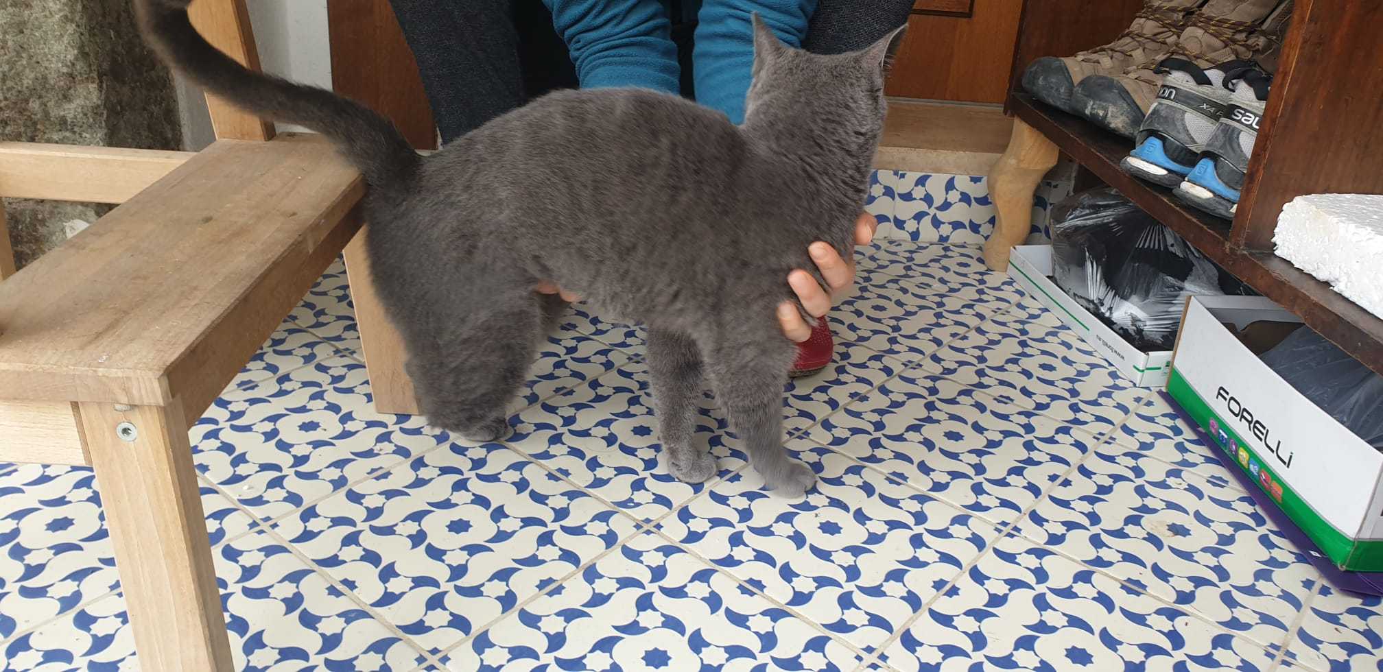 Dün gece kapımıza geldi, duman rengi, sağ arka ayağı yok, boynunda beyaz ufak bir leke var.