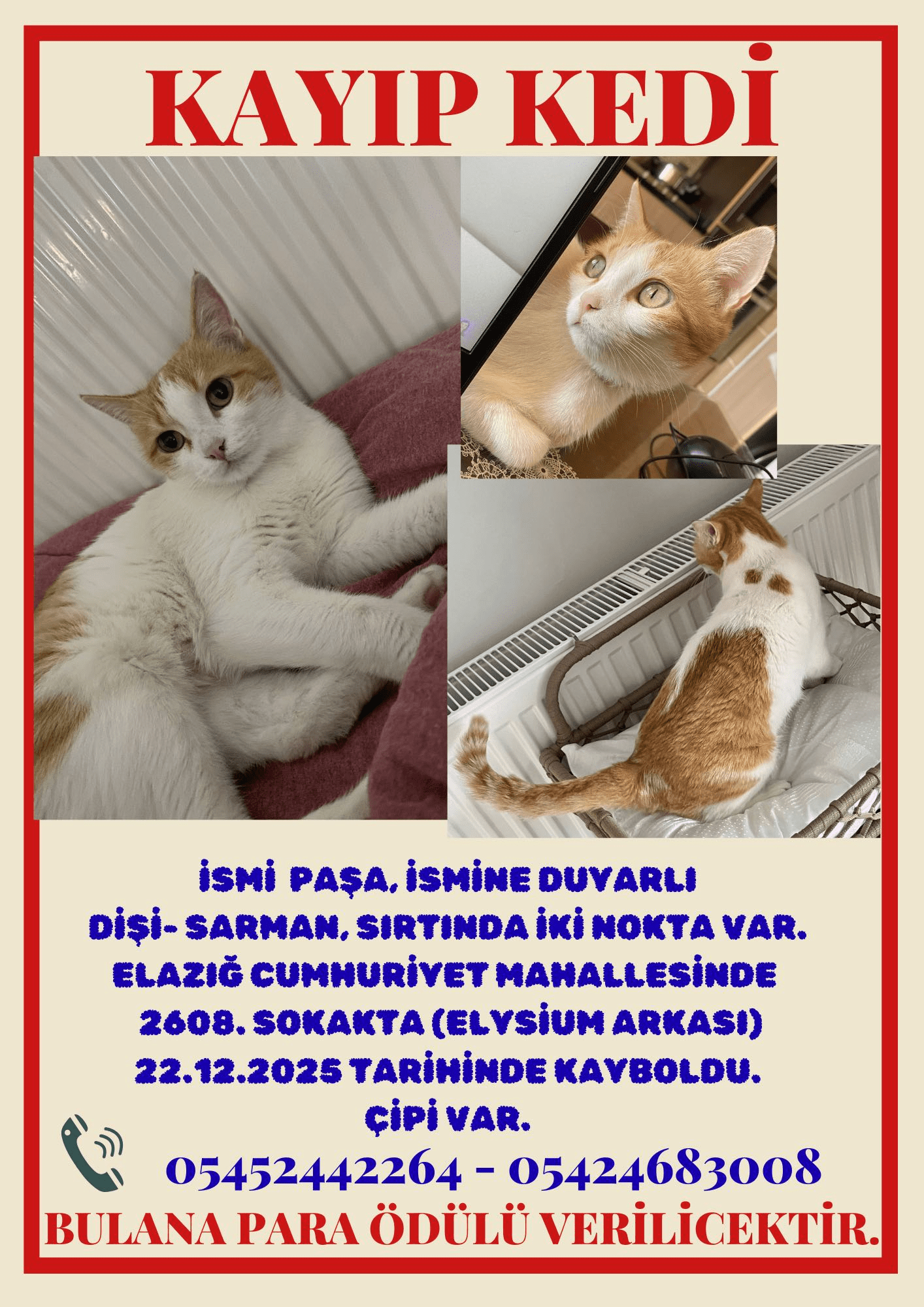 22 aralık 21:00 da Elazığ / Merkez / Cumhuriyet Mahallesi / Nilsu Apartmanından (Koza Anaokulu yanı) kaybolan kedimiz Paşayı görürseniz bulursanız lütfen iletişime geçin. Para ödülü verilecektir.