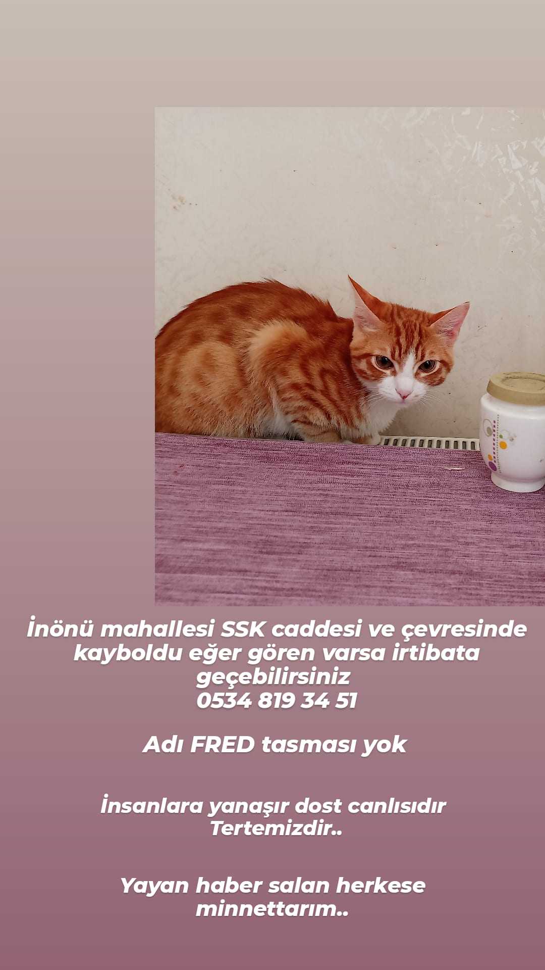 Kedim FRED erkektir ismine duyarlıdır gözleri ela dir kuru mamadan baska birşey yemez sokakta yaşayamaz Küçük kardeşim çok üzülüyor lütfen herhangi bir bilgiye sahip olan birisi bana ulaşsın herşeyi yaparım....