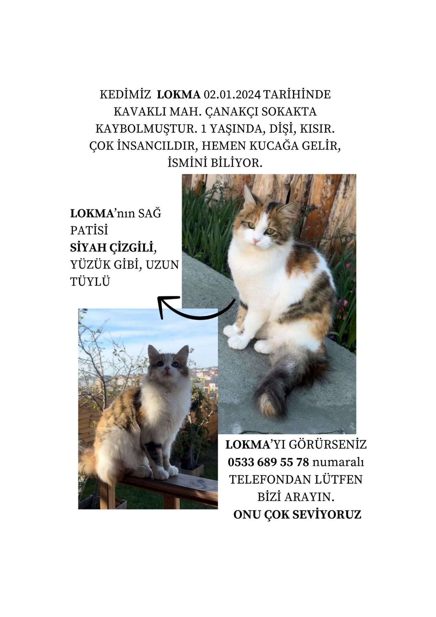 Kavaklı mahallesi çanakçı sokak civarında 02.01.2024 tarihinde Kedimiz Lokma kaybolmuştur. sağ ön patisinde yüzük gibi çizgisi vardır. Yaklaşık 1 yaşında uzun tüylü, dişi ve kısır. Çok insancıldır, kucağa gelir, Beylikdüzü kavaklı mah. çanakçı sokak civarında görürseniz, ya da sahipsiz sanıp biri aldıysa lütfen bize ulaşın, günlerdir arıyoruz.
