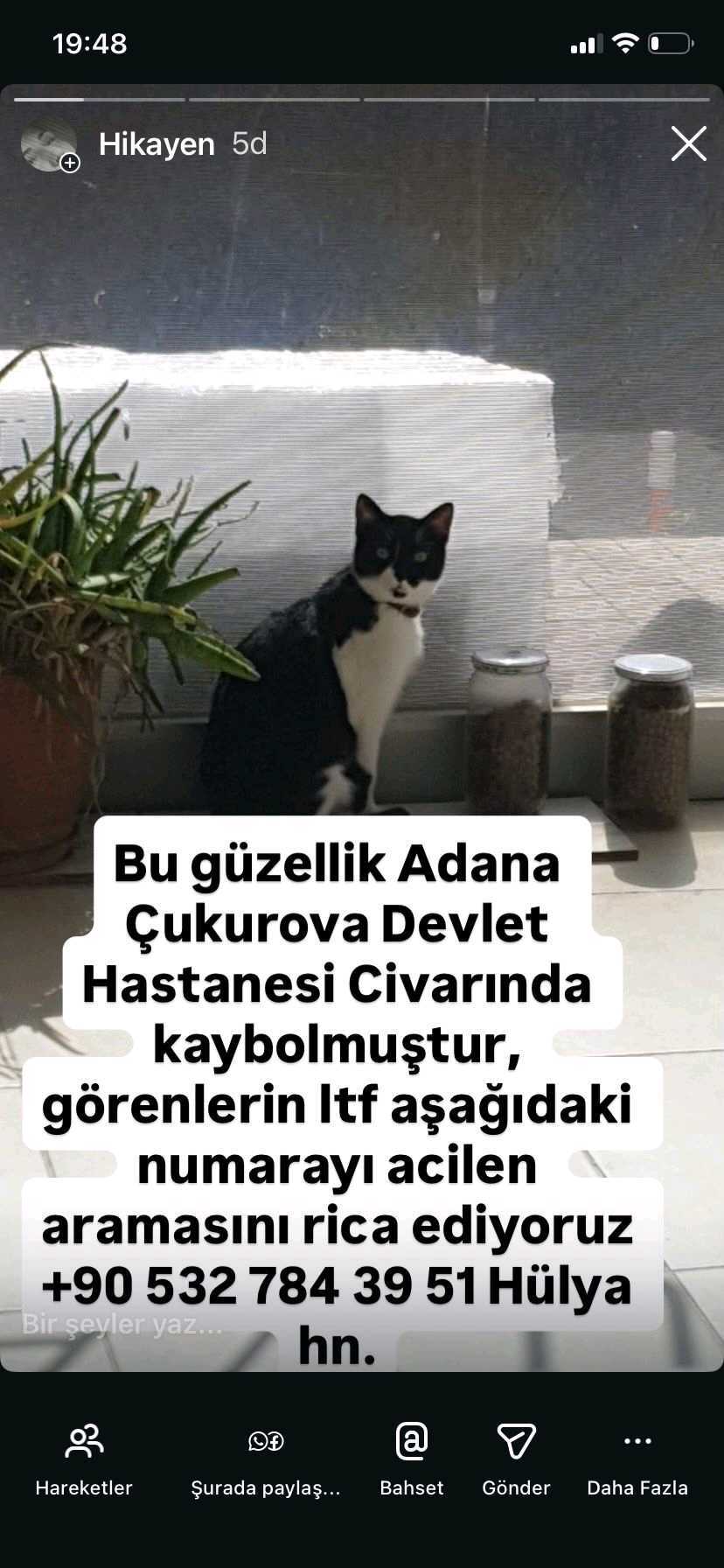Hoya isimli dişi smokin kedim Adana Çukurova Devlet hastanesi civarında bir haftadır kayıp, boynunda tasma bulunmaktadır.