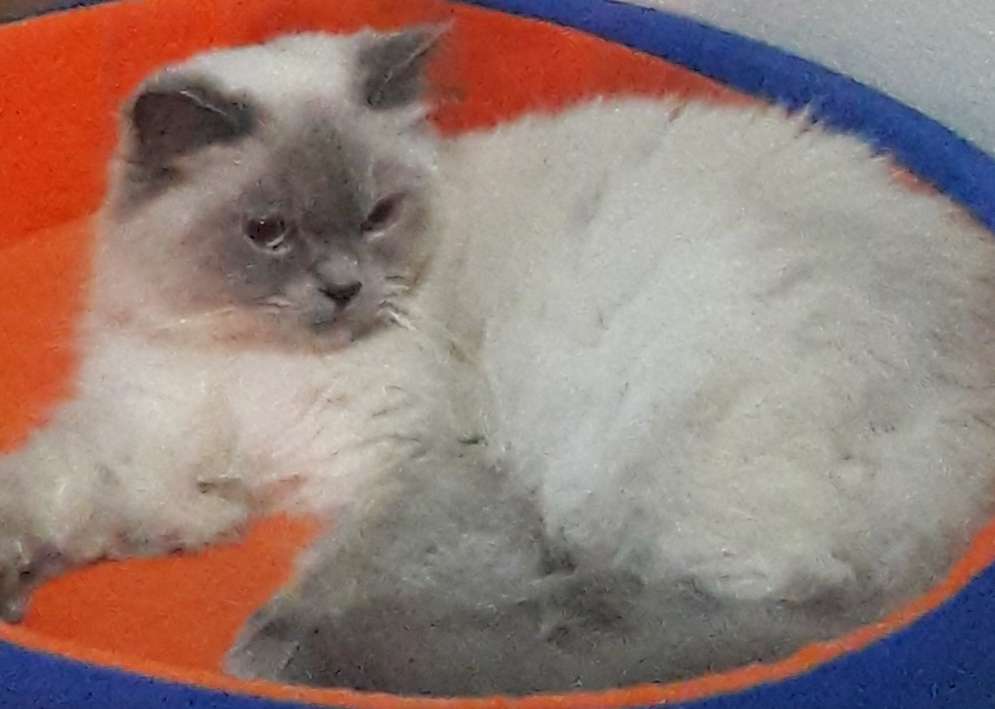 Siyam kedisi gri beyaz tüyleri pofuduk pofuduk ürkek ama akilli ismini söyleyince hemen miyavlar