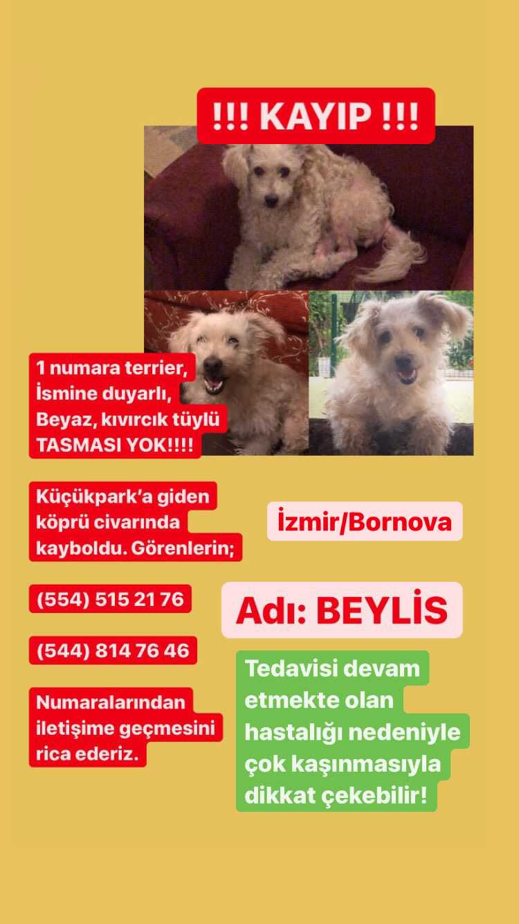 BEYLİS 1 numara dişi terrier, İsmine duyarlı, Beyaz, kıvırcık tüylü Tedavisi devam etmekte, kaşıntısı yüksek İzmir/Bornova’da Küçükpark’a giden köprü civarında 29.06.2021, 13:00 sularında kayboldu.