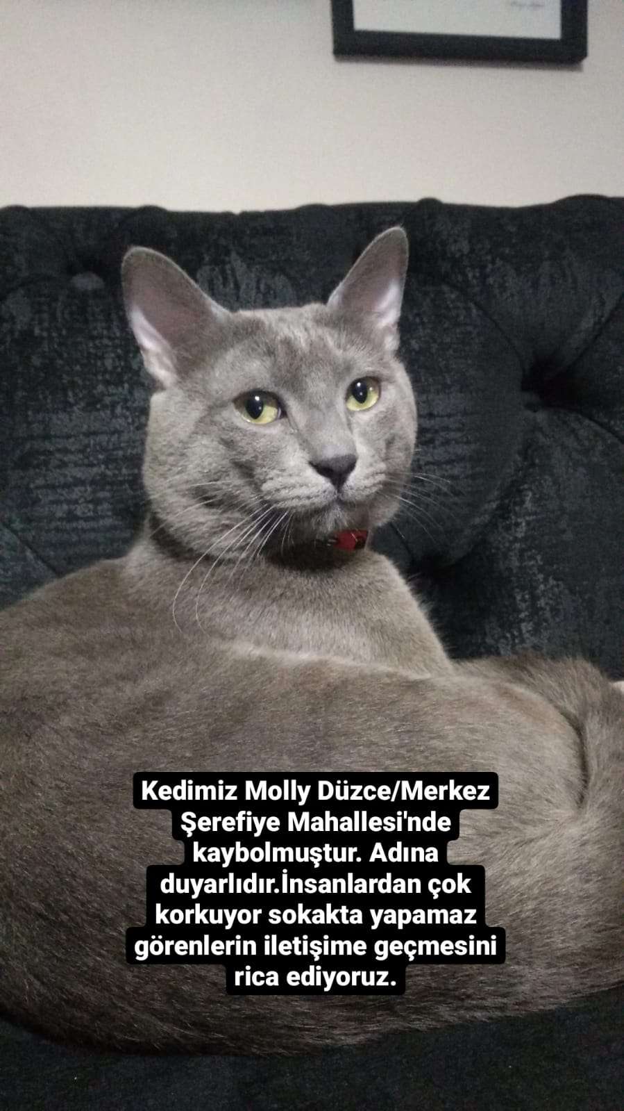 Düzce Merkez Şerefiye Mahallesinde 18.09.2022 tarihinde kedimiz Molly evden kaçmıştır. 2 yaşında erkek Rus kedisi. Gri renkli kehribar gözlü. Adına duyarlıdır. Evden dışarı hiç çıkmazdı. İnsanlardan çok korkuyor, sokakta yapamaz. Görenlerin iletişime geçmesini rica ediyoruz. Hazal Bulut instagram adresi: @hazaal.blt