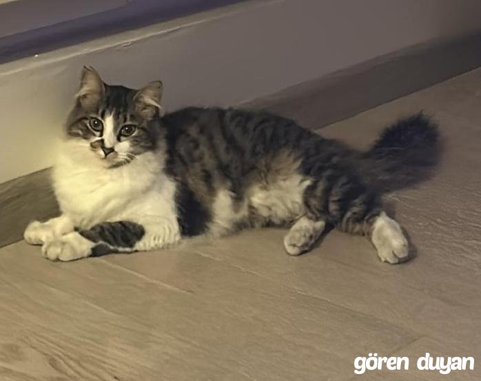 31 Kasım 2025 tarihinden beri kayıp olan kedim, son derece uysal, oyuncudur. Ağız bölgesinde koyu leke vardır. Alt gövdesi beyazdır. Üst alanı beyaz, siyah, yeşil, gri karışıklık renkte tüylerden oluşmaktadır. Sokak kedisidir ancak 1.5 yıldır evde yaşıyordur. İstanbul Erenköyde apartman önünden kaybaldu.