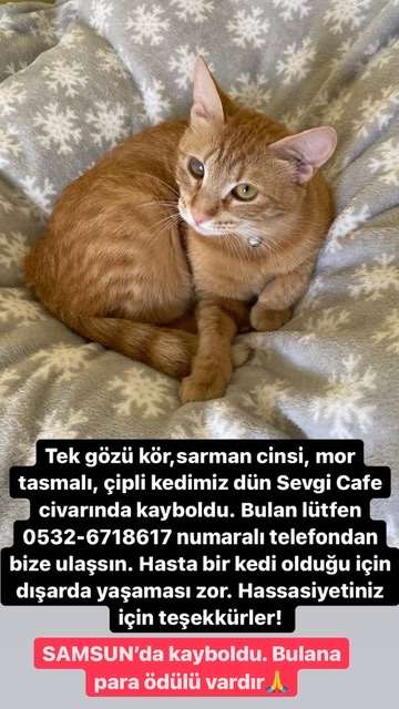 Merhaba, Sarman kedimiz Hera Pazar günü SAMSUN Sevgi Kafe civarında kayboldu. Boynunda mor tasması var. Tek gözü kör. Çipli. Bulana para ödülü vardır. Hassasiyetiniz için teşekkür ederiz..