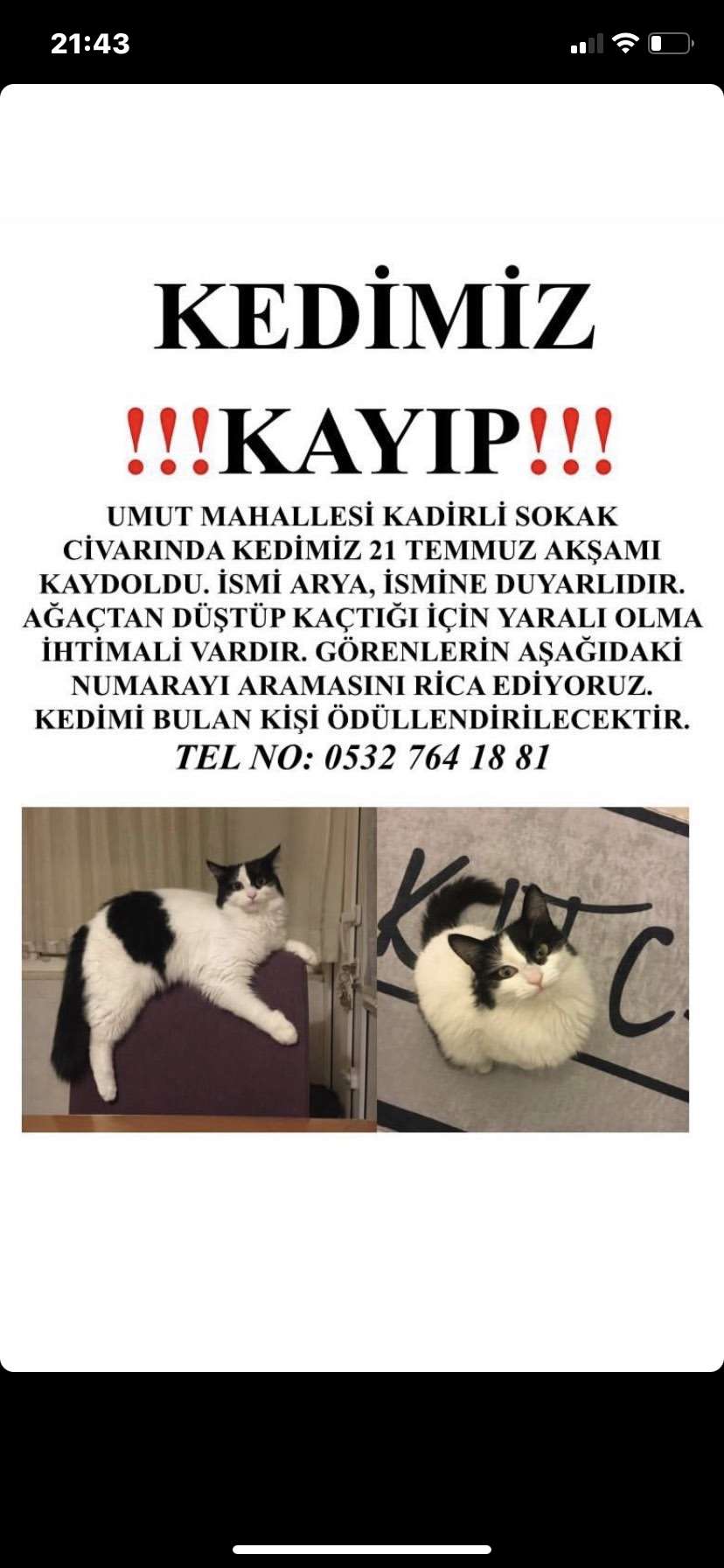 Kedimiz 21 Temmuz akşamı Ankara Çankaya Umut Mahallesi Kadirli sokakta kayboldu. İtfaiye yardımı ile ağaçtan indirilmeye çalışılırken ağaçtan düşerek korkudan kaçtı. Yaralı olma ihtimali var. İsmine duyarlıdır. Bulan ödüllendirilecektir.