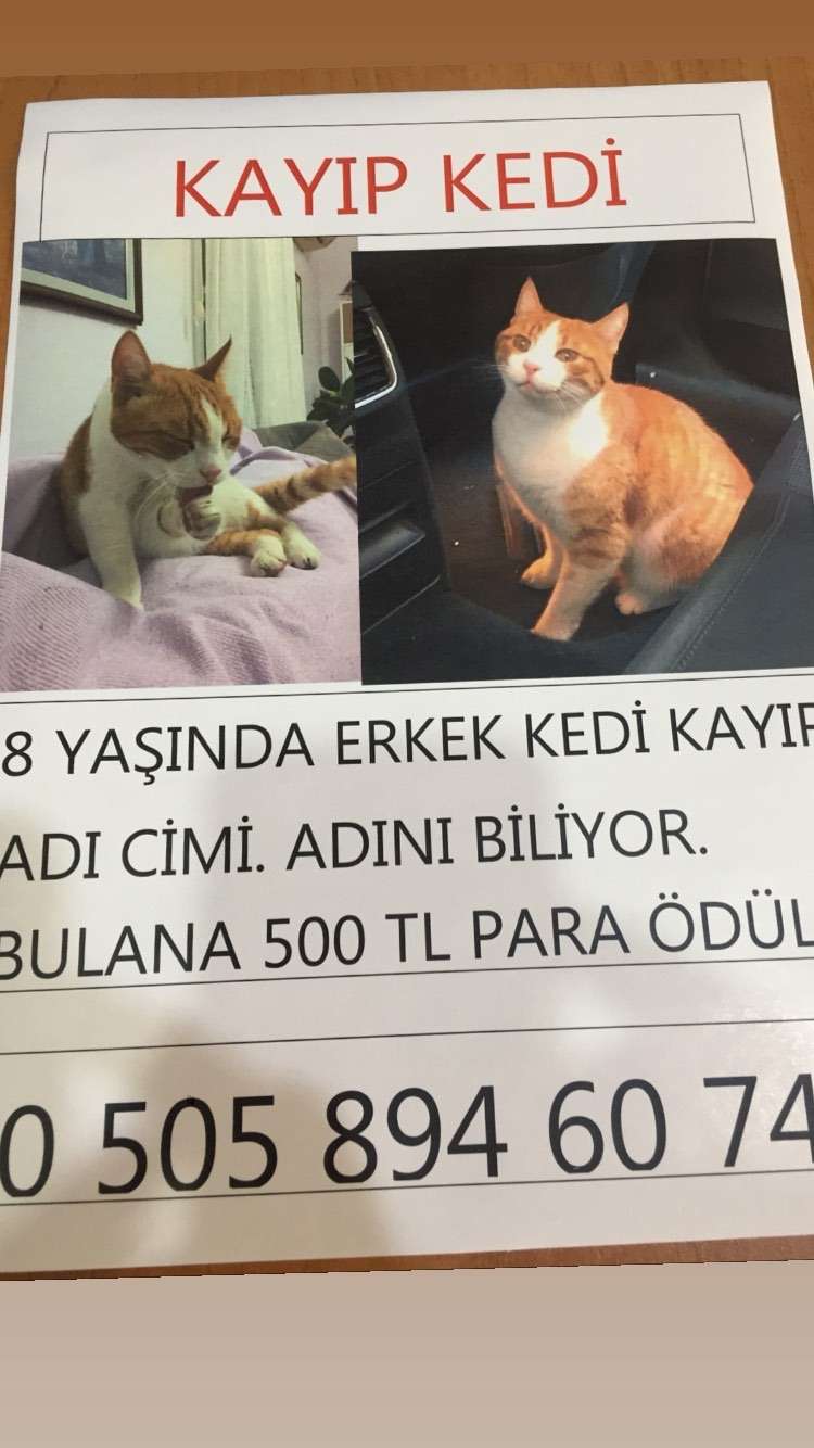 İzmir Hatay Nokta’da Kayboldu. 11 Eylül’den beri yok. Adı Cimy. Adını biliyor. 8 yaşında, erkek kedi. Turuncuya yakın sarı, ve beyaz renkli. Bulana para ödülü var. Bulursanız: 0505 894 60 74
