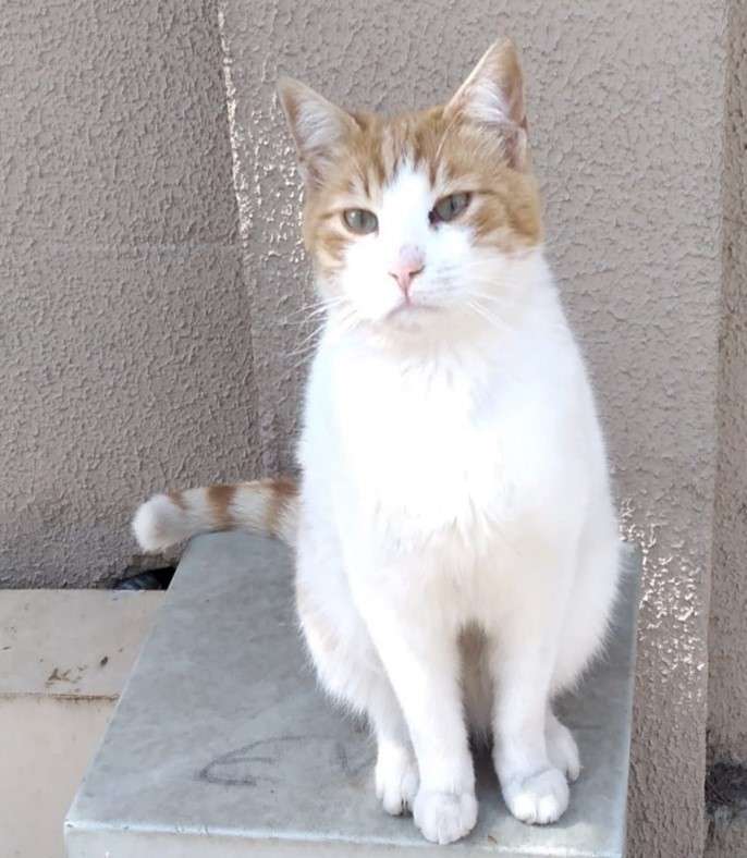 sarı beyaz, uysal, sakin bir kedi. yuvarlanmaya, kendini sevdirmeye bayılır.