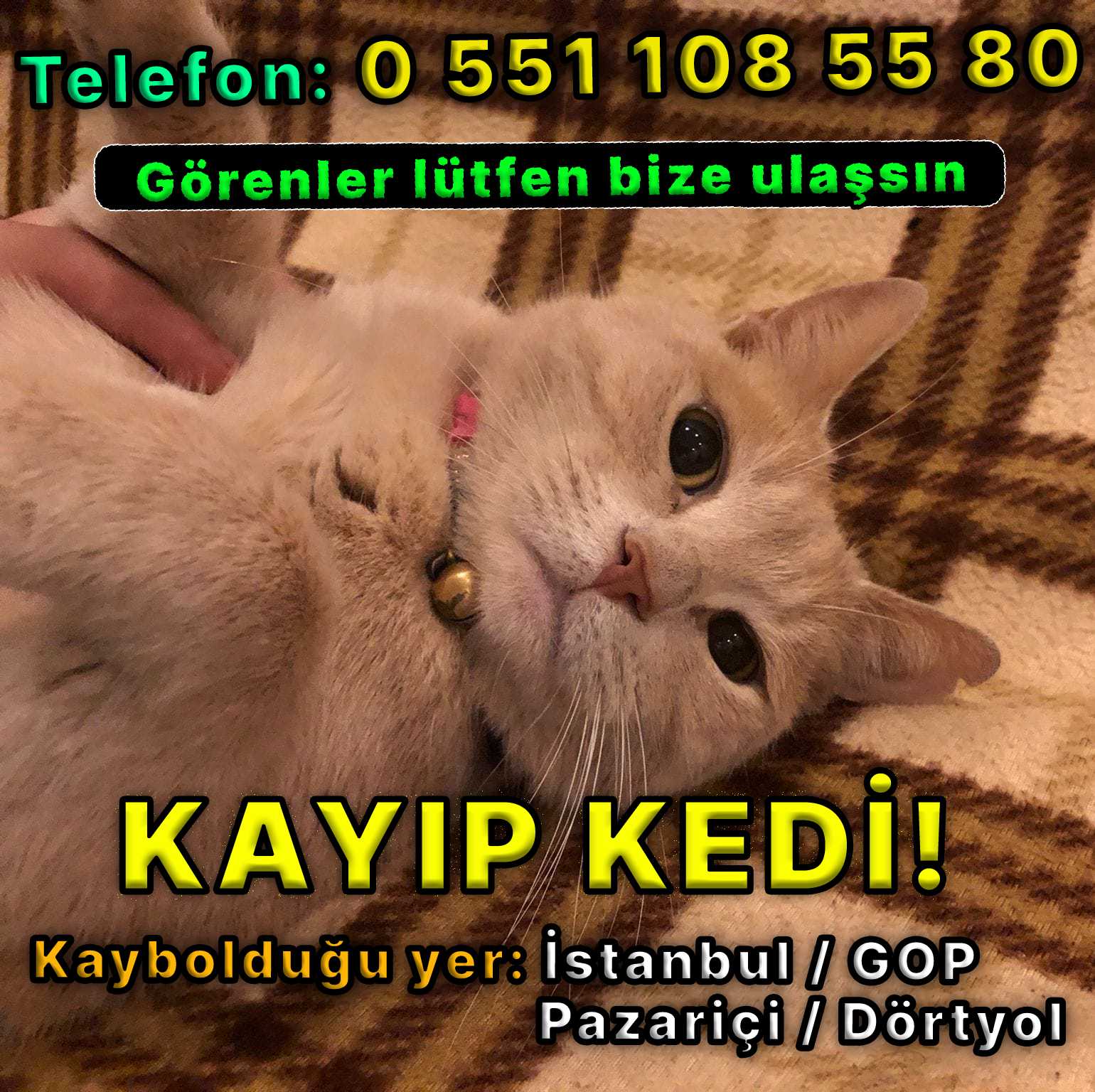 İstanbul Gazi Osman Paşa bölgesi, Pazariçi/Dörtyol'da kedimiz kayboldu. 3 Gün önce kayboldu.(2 Nisan 2024) Kedinin ismi Müezza, seslenince geliyor. Görürseniz lütfen bize ulaşın.