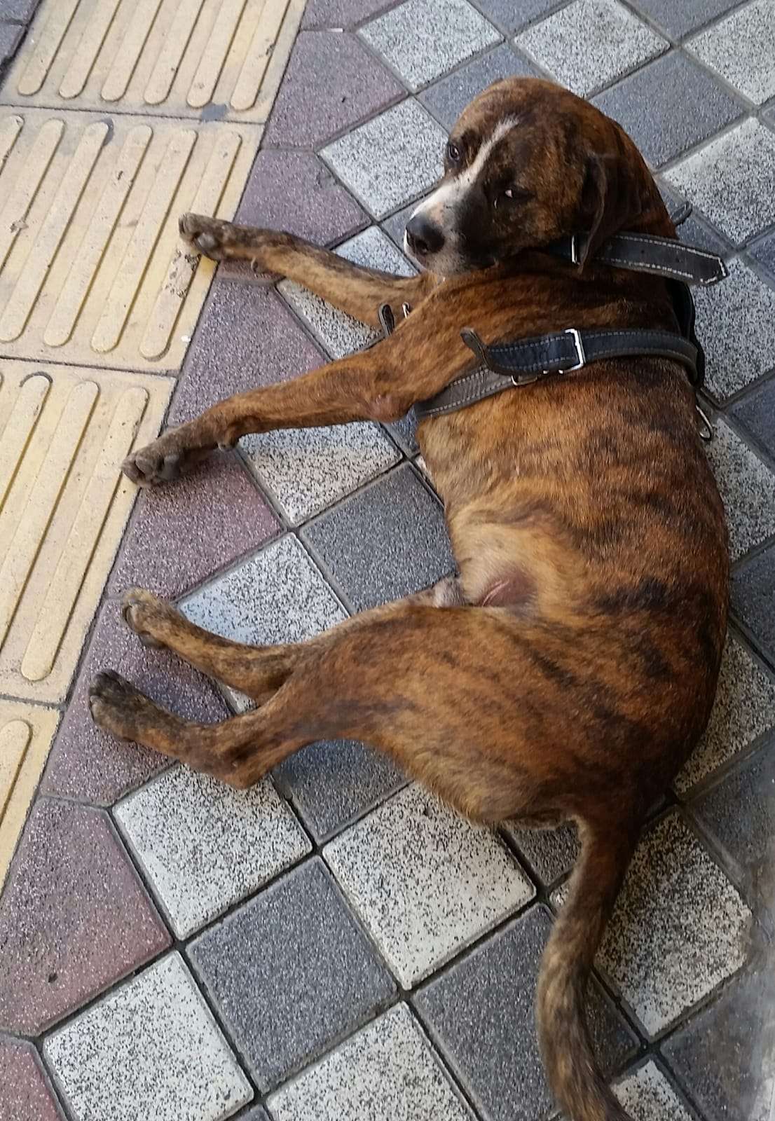 Cinsini bilmiyorum ama sahibini kaybetmis. Kahverengi tasmasi var ve sol bacak kisminda 3 cizik darbesi var. Korkulu halde gorunuyor hayvan.