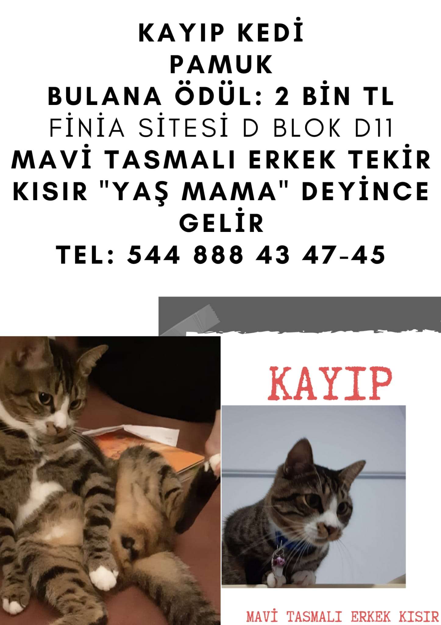 Merhaba. 7 yaşındaki kedimiz Pamuk, birkaç gündür kayıp. Kısır, çipli ve erkek bir tekir kedi. Kendisi böbrek hastası, Özel mama yemesi gerekiyor. Kaybolduğunda, boynunda takılı olan tasmada isim ve telefon numarası yazıyor. İstanbul - Pendik - Yayalar mahallesinde kayboldu. Görenlerin iletişime geçmesini rica ediyorum. Bulana 2000 lira ödül verilecektir.