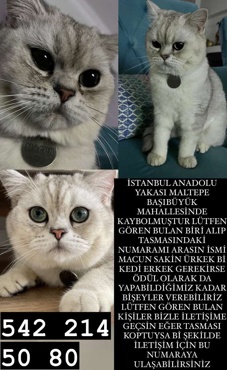 İstanbul Maltepe başıbüyük te kedim evden kaçtı tasmasında ismi ve telefon numaram yazıyo beyaz siyah lekeleri olan erkek bir bristish short hair 22 ağustos gece onbir buçuk onikiye doğru kayboldu geceden beri arıyoruz yedi sekiz aylık civarı tombikti hafif