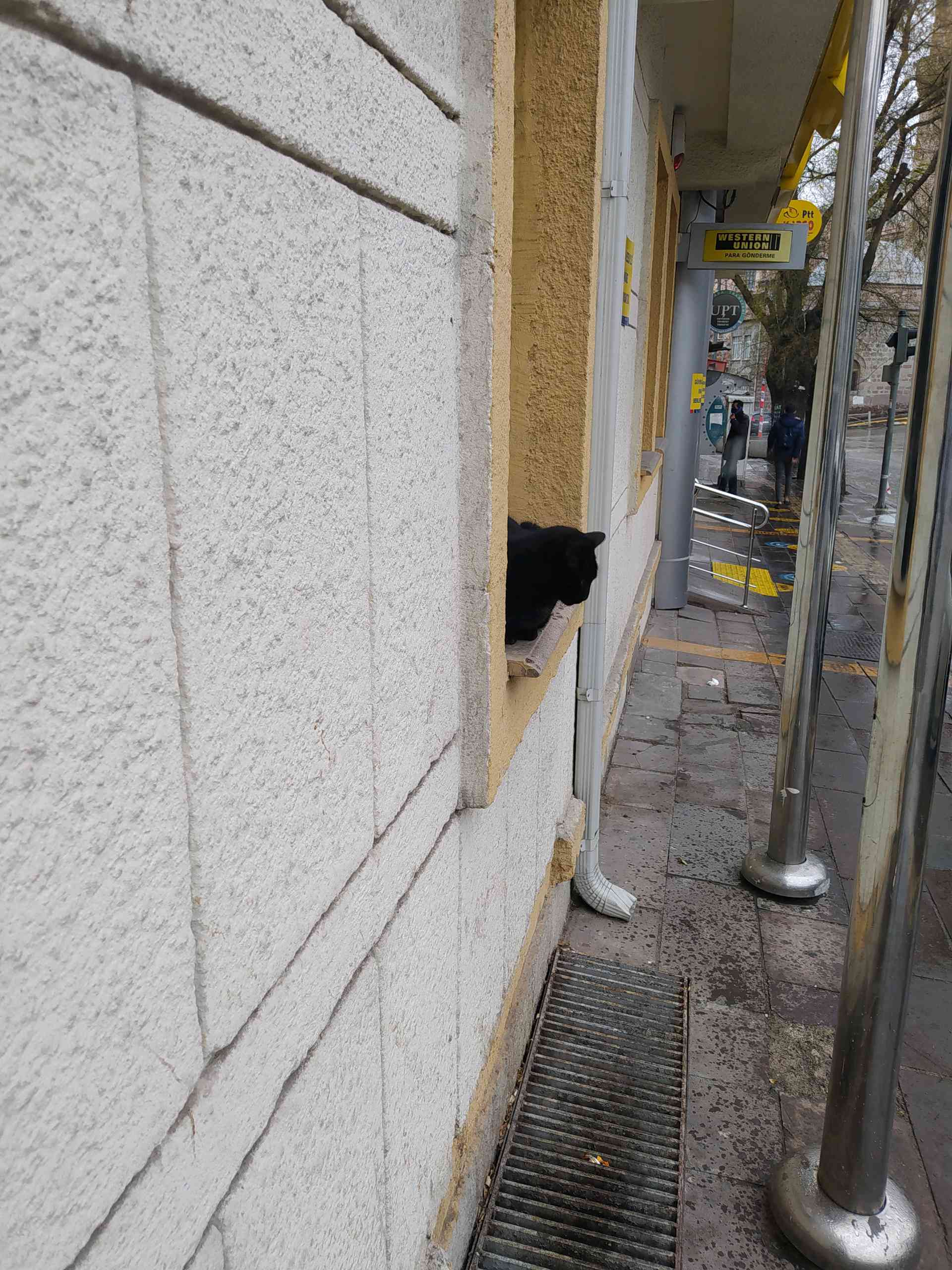 ev kedisi olduğunu düşünüyorum siyah bir kedi biraz iri yapılı temiz bir kedi cadde üzerinde gidip geliyor.