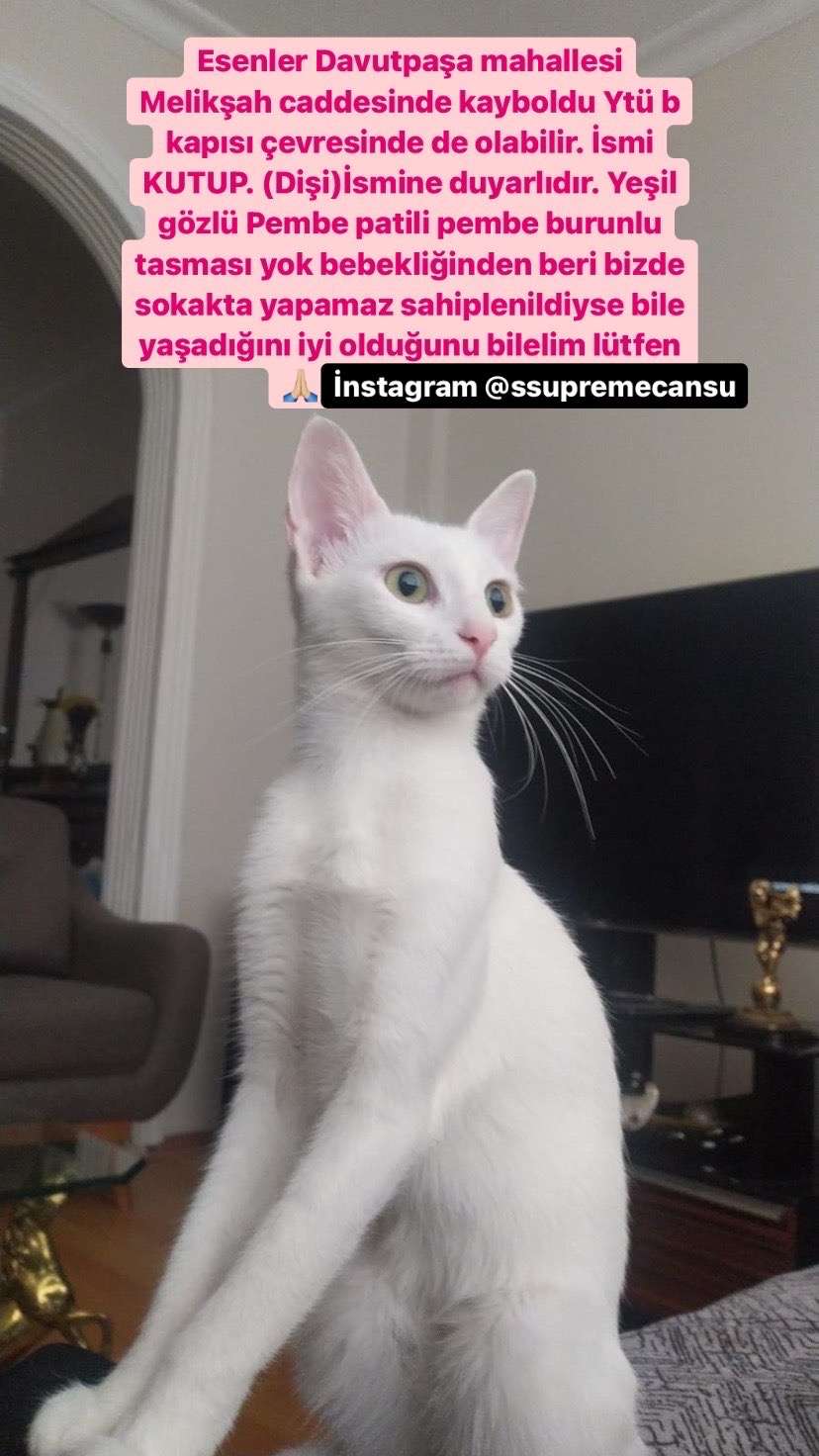Esenler Davutpaşa mahallesi Melikşah caddesinde kayboldu Ytü b kapısı çevresinde de olabilir. İsmi KUTUP. İsmine duyarlıdır. Yeşil gözlü Pembe patili pembe burunlu tasması yok bebekliğinden beri bizde sokakta yapamaz sahiplenildiyse bile yaşadığını iyi olduğunu bilelim lütfen
