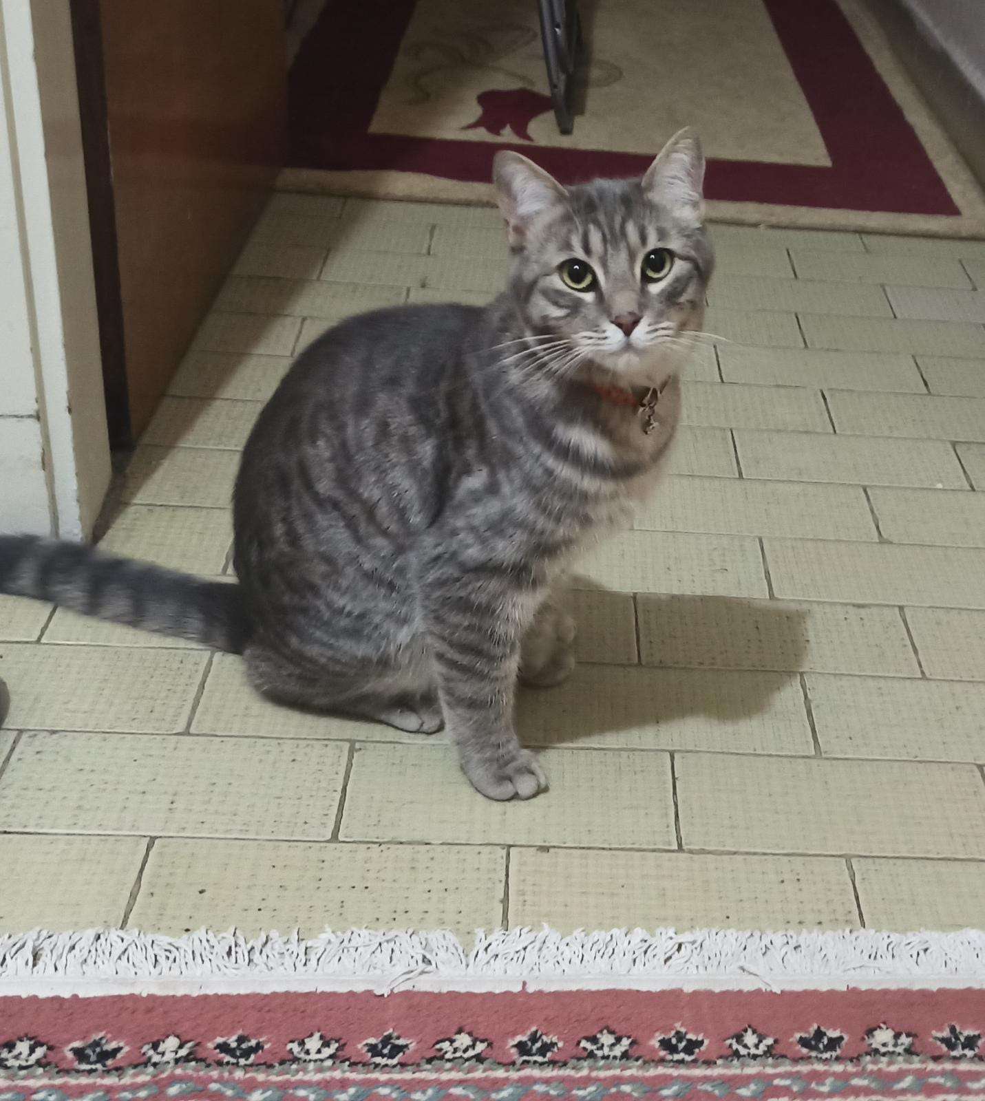 Konya Yeni Meram Caddesi, Havzan mahallesi, meteorolojinin yanında gri renkte, turuncu tasmalı bir kedi buldum.
