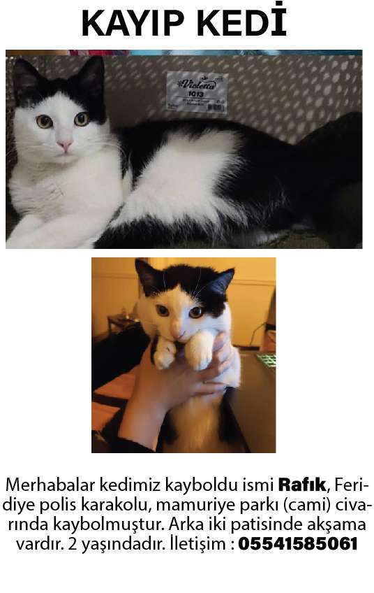 Merhabalar kedimiz kayboldu ismi Rafık, KONYA Feridiye polis karakolu, mamuriye parkı (cami) civarında kaybolmuştur. Arka iki patisinde akşama vardır. 2 yaşındadır. İletişim : 05541585061. Paylaşırsanız çok seviniriz.