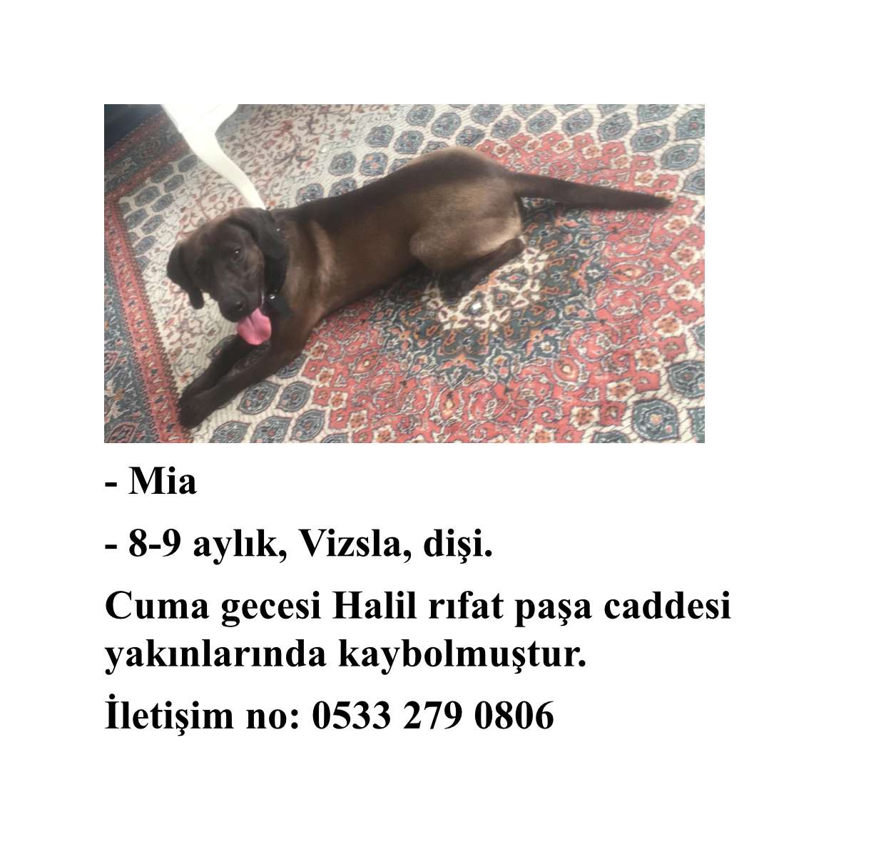 Dişi, 8-9 aylık. Vizsla. Cumartesi gecesi Halil Rıfat caddesi yakınlarında kaybolmuştur.