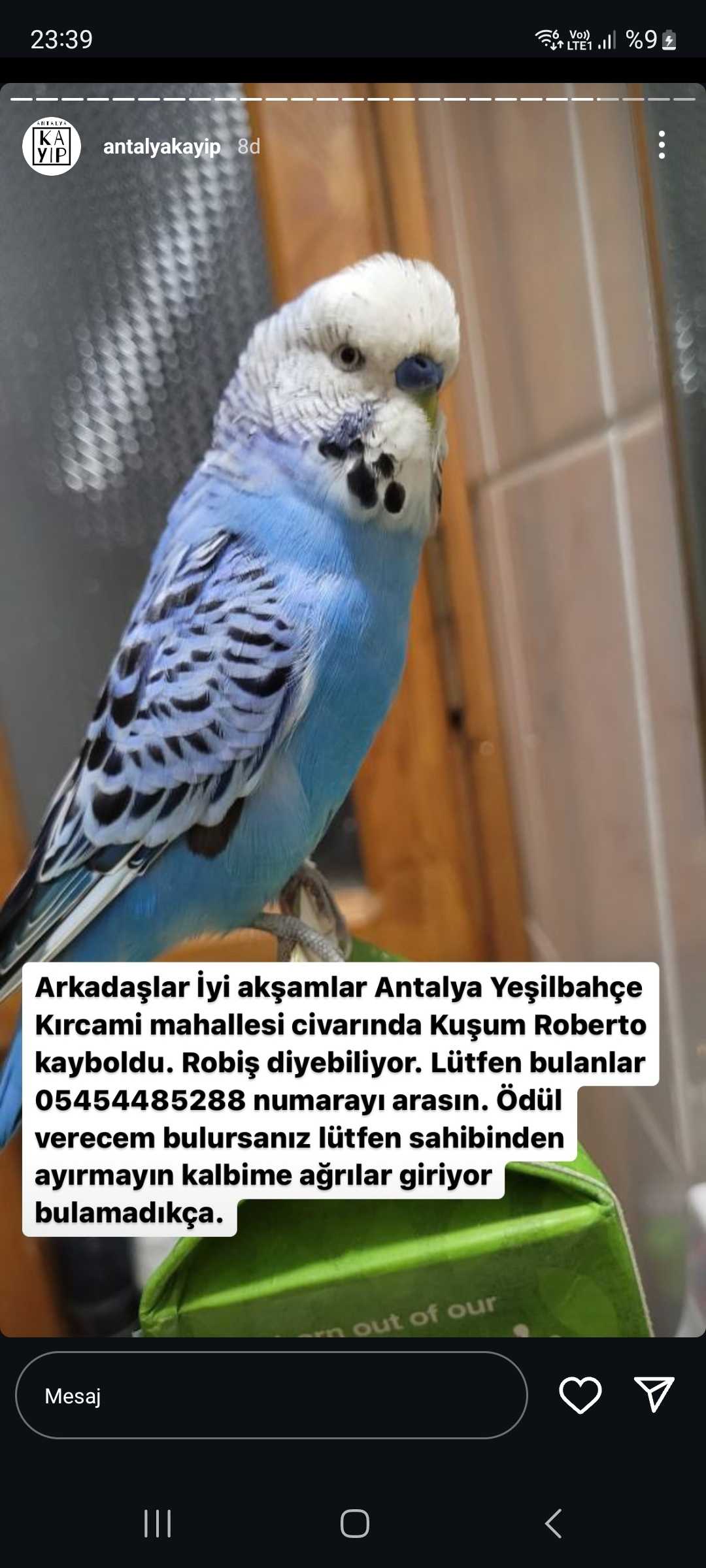 Mavi renkte Robiş isimli muhabbet kuşum kayboldu. Adını söyleyebiliyor erkek 2 yaşında. Birkaç kelime söyleyebiliyor Cici kuş aşkım gibi. 28 Haziran 2024 saat 19.30 sularında kaçtı. Görenlerin duyanların 05454485288 ile iletişime geçmesini rica ediyorum kuşum olmadan kalbim ağrıyor.