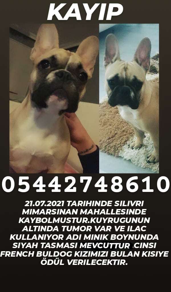 ADI MINIK 11 AYLIK FRANSIZ BULDOG FAWN RENGI SILIVRI MIMARSINAN MAHALLESINDE KAYBOLMUSTUR EN SON ORTACESME CIVARINDA GÖRÜLDÜ KUYRUGUNUN ALTINDA TUMOR PARCASI VAR ILAC KULLANIYORDU VE AMELIYAT OLACAKTI GORENLERIN BIZE ULAŞMASI RICA OLUNUR KIZIMIZI BULANA ÖDÜL VERILECEKTIR.