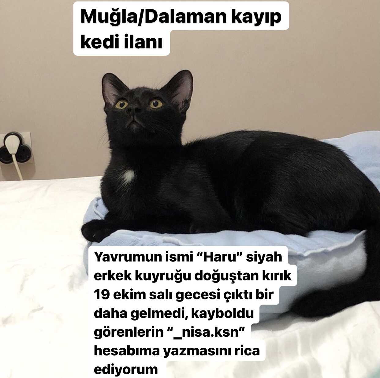 19 ekim salı günü 6 aylık kedim “Haru”Muğla/Dalaman’da kayboldu. siyah renkli, erkek, kuyruğu doğuştan kırık kopuk değil sadece kırık görünüyor. Simsiyah sadece boynunun altında beyaz tüy topağı var.. canımdan çok sevdiğim oğlumu gören lütfen benimle iletişime geçsin.